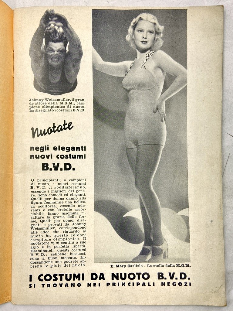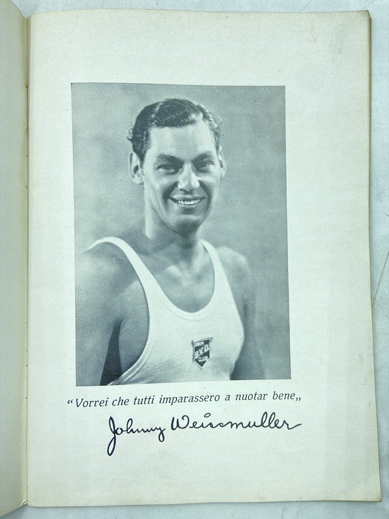 Brossura editoriale illustrata, spillato, cm 19.5 x 13.5, pp 48 illustrate in nero. Manualetto di nuoto stampato «su concessione della Compagnia B.V.D. fabbricante la famosa biancheria B.V.D. e i costumi da bagno B.V.D.». Johnny Weissmuller, nato da famiglia tedesca nella Romania austro-ungarica e naturalizzato statunitense, fu uno dei più premiati nuotatori olimpionici degli anni ’20; nel 1930 pubblicò un manuale sull’American Crawl (stile libero) da cui queste note sono presumibilmente estratte. La sua notorietà gli valse un contratto con l'azienda di costumi da bagno BVD, posando come modello, prestando il suo nome, e partecipando a tour promozionali. Negli anni Trenta divenne attore, e fu il più celebre Tarzan del grande schermo interpretando il personaggio creato da Edgar Rice Burroughs nella serie di film prodotti dalla MGM. Nel fascicolo Weissmuller posa (in costume BVD) per illustrare le tecniche illustrate, e con Jack Dempsey nell'atto di spiegargli l'American Crawl; presente inoltre una pagina pubblicitaria con fotografia dell'attrice Mary Carlilse.