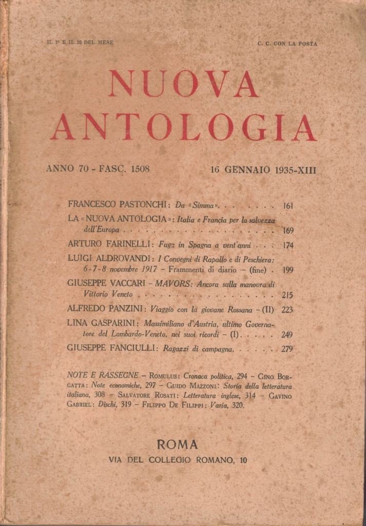 Nuova Antologia, diretta da Luigi Federzoni, anno LXX, fascicolo 1508, 16 gennaio 1935-XIII, Roma, pp. VIII, 161-320, ill. b.n., cm 25, br. ed. Al dorso: n. 2. Indice: Francesco Pastonchi, Sa Simma – La Nuova Antologia, Italia e Francia per la salvezza dell’Europa – Arturo Farinelli, Fuga in Spagna a vent’anni – Luigi Aldrovandi, I Convegni di Rapallo e di Peschiera: 6-7-8 novembre 1917. Frammenti di diario (fine) – Giuseppe Vaccari (Mavors), Ancora sulla manovra di Vittorio Veneto – Alfredo panzini, Viaggio con la giovane Rossana (II) – Lina Gasparini, Massimiliano d’Austria, ultimo Governatore del Lombardo-Veneto, nei suoi ricordi (I) – Giuseppe fanciulli, Ragazzi di campagna – Note e rassegne. Tracce d’uso, minime fioriture, ma buona copia.
