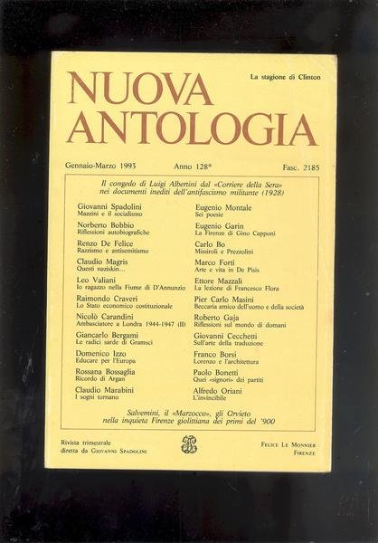 IN 8°, pp.VII + 493 + c.17 DI PUBBLICITA', COPERTINA EDITORIALE CON TITOLO ED INDICE SU<BR>FONDO GIALLO. RIVISTA TRIMESTRALE DIRETTA DA GIOVANNI SPADOLINI, GENNAIO-MARZO, 1993 , ANNO 128° , FASC. 2185. OTTIMA CONSERVAZIONE. ID1495