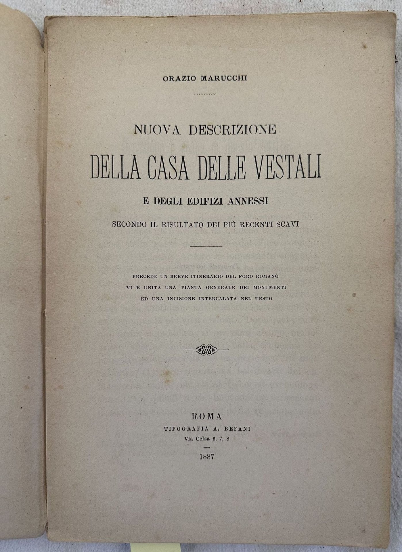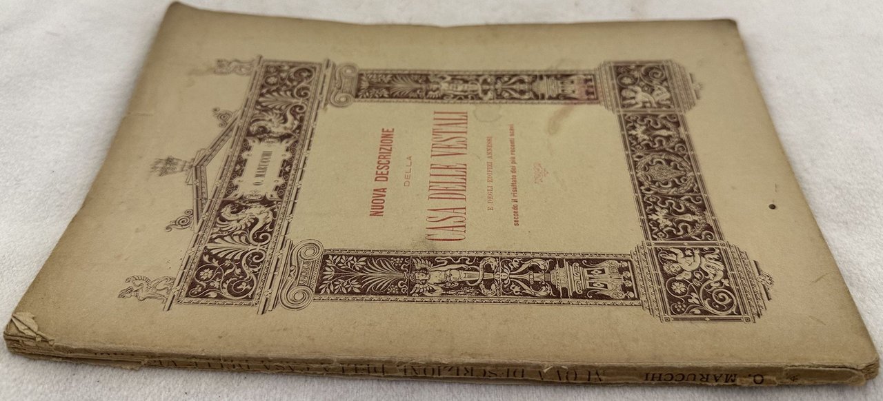Interessante monografia del 1887, la nuova descrizione della casa delle vestali ed edifici annessi scritta da Orazio Marucchi. Alla fine del volume tavola ripiegata. In discrete condizioni. Copertina editoriale in discrete condizioni generali con lievi usure ai margini e dorso. Piatto posteriore staccato. Legatura in discrete condizioni con lievi rotture. All'interno le pagine si presentano in buone condizioni con fioriture. In 8. Dim. 21,5x14 cm. Pp. 87+1 pl.Interesting monography of 1887, the new description of the house of vestali and near buildings written by Orazio Marucchi. A plate at the end. In fair conditions. Editorial cover in fair general conditions lightly worn in the extremities. Back plate is detached. Binding in fair conditions with light cracks. Inside pages are in good conditions with foxing. In 8. Dim. 21,5x14 cm. Pp. 87+1 pl.