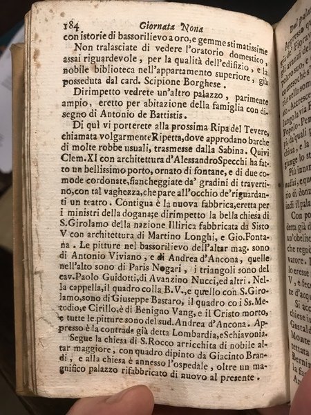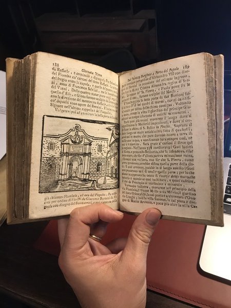 [ROMA - GUIDA] In-8, pp. 232, con 18 graziose incisioni in legno a mezza pagina. Alcuni esemplari sembrerebbero includere un’antiporta raffigurante Roma. Tuttavia, la copia digitalizzata della BNC di Roma (consultabile in versione digitale tramite Opac Sbn) non presenta alcun’antiporta, come neppure le altre copie disponibili sul mercato. Potrebbe trattarsi di una variante di stampa, oppure che sia un vera rarità, difficilissima da trovare, una copia con l’antiporta.