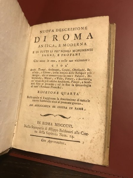 Nuova descrizione di Roma antica, e moderna e di tutti li più nobili monumenti sagri, e profani che sono in essa, e nelle sue vicinanze: cioè archi, tempj, anfiteatri, cerchi, obelischi, basiliche, e chiese, colla notizia delle reliquie più insigni, che si conservano in esse: palazzi, biblioteche, musei, e ville, pitture, e scolture, co' nomi de più celebri architetti, pittori, e scultori fino al presente; ed in fine la cronologia di tutt'i romani pontefici. Edizione quarta nella quale si è aggiunta la descrizzione di tutte le nuove fabbriche sino al presente giorno. Ed arricchita di figure in rame