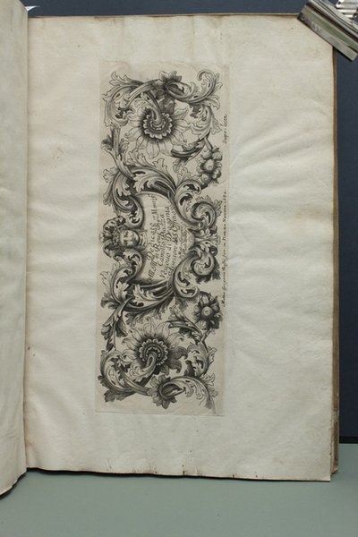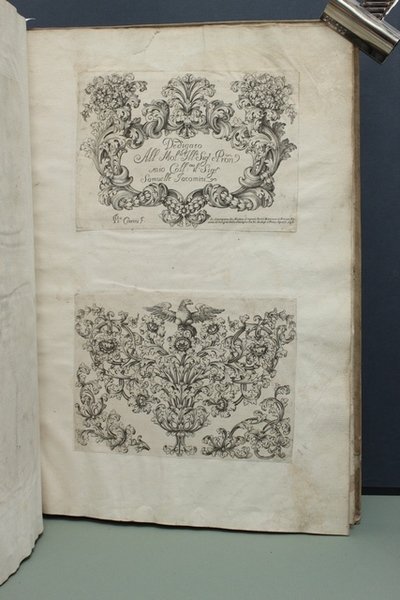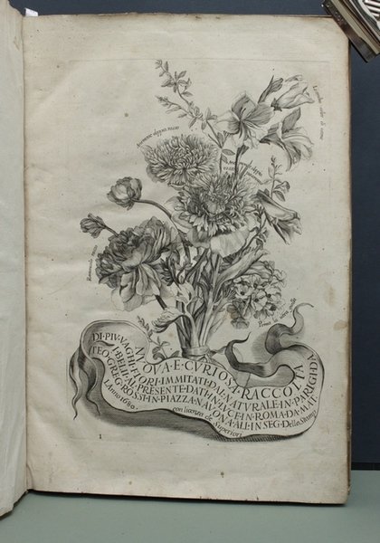 Tre serie di incisioni in un vol. in - folio; sui primi 12 fogli del volume sono incise in rame 12 tavole di composizioni floreali (20,8 x 30,7 cm); seguono 13 fogli su ciascuno dei quali Š applicata una incisione con motivo ornamentale (29,2 x 10.9 cm); su ciascuno degli ultimi 3 fogli sono applicate 2 incisioni con motivi ornamentali (17,2 x 12,2 cm). Legatura coeva in tutta pergamena. Esemplare proveniente dalla vendita Martini: ottobre 1931 (ritaglio del catalogo applicato al contropiatto posteriore). Il volume contiene tre rarissime serie complete di incisioni uscite dalle stampe romane di Matteo Gregorio Rossi. Interessante notare come la carta su cui sono incise le prime 12 figure sia la stessa su cui sono applicate le altre due serie, stampate a pochi anni di distanza dalla prima: Š verosimile dunque che il volume sia stato composto all'epoca e che le ultime due serie siano state applicate poco dopo o contestualmente alla loro pubblicazione. Le dodici composizioni floreali incise a piena pagina sono riprese dall'opera del pittore ed incisore francese Jacques Bailly: "Divers Fleurs Mises en Bouquets, dessines et graves" (Parigi 1670). Rispetto all'edizione originale sulle lastre sono stati aggiunti i nomi in italiano dei singoli fiori che compongono i bouquets ed Š stato cambiato il frontespizio. Seguono due serie di stampe con motivi ornamentali, composte da dodici incisioni ciascuna. La prima incisione di ogni serie racchiude una dedica: nel primo caso a Monsignore Camillo Piazza e nel secondo a Sig. Samuelle Iacomini. In quest'ultimo caso Š presente anche il nome dell'artista, Pietro Cerini, che potrebbe essere autore anche della serie precedente. (Bailly): Berlin Katalog 4434. Nissen 67 (per errore indica 13 tavv.). Dunthorne 21 (edizione francese). An Oak Spring Flora 46, n. VI (edizione francese). (Cerini): Berlin Katalog 879. (CERINI PIETRO?). (Dieci incisioni di fregi floreali montati in formato in - folio con alla prima incisione "dedicato all'Ill. e Rev. Sig. Mons. Camillo Piazza"). - Roma, Matteo Gregorio Rossi in Piazza Navona, 1682. (Unito:) CERINI PIETRO. (Sei incisioni montate su tre carte in - folio con decorazioni floreali "dedicate all'Ill. Sig. Samuelle Jacomini"). - Roma, Matteo Gregorio De Rossi in Piazza Navona, 1696.