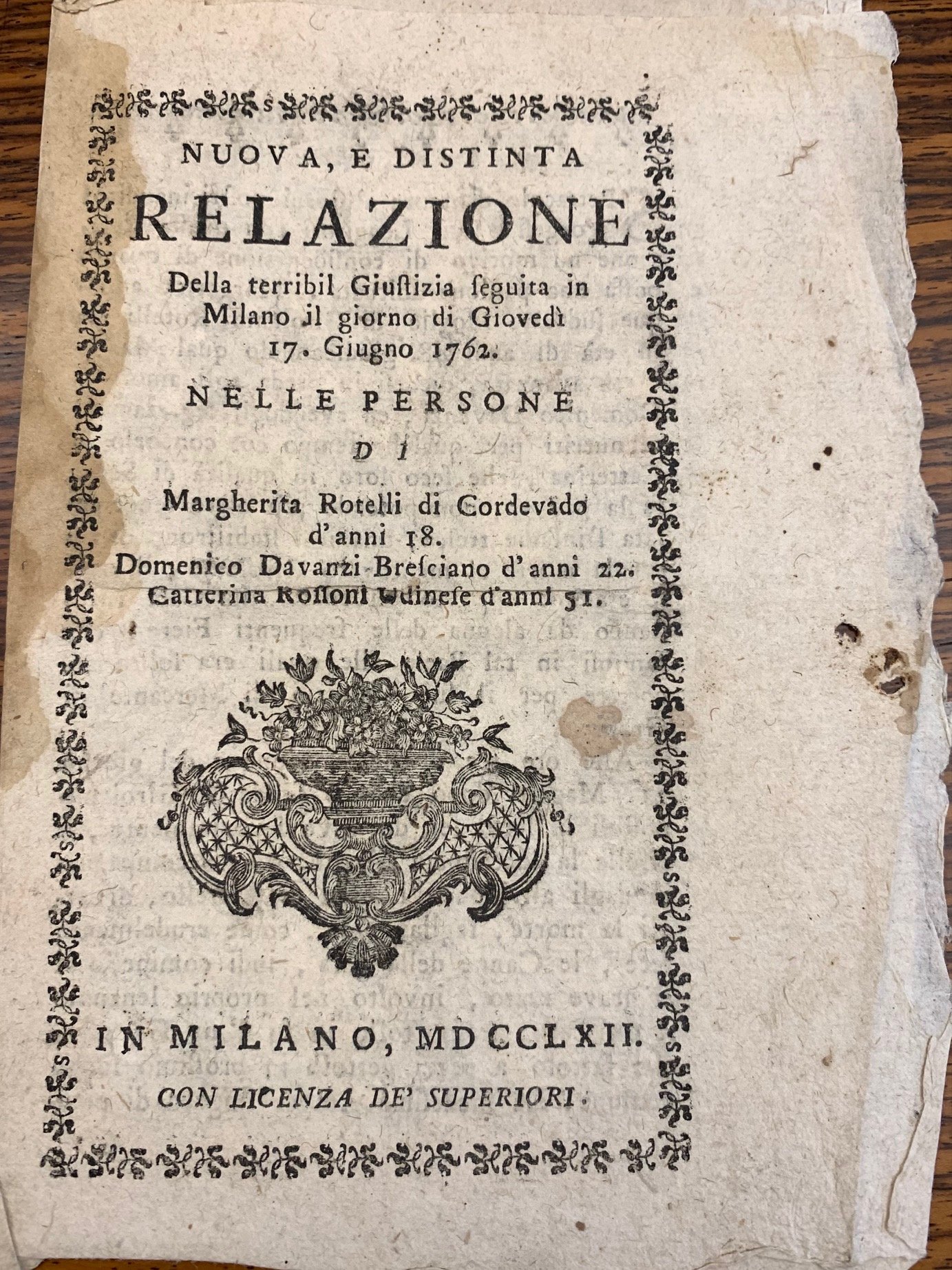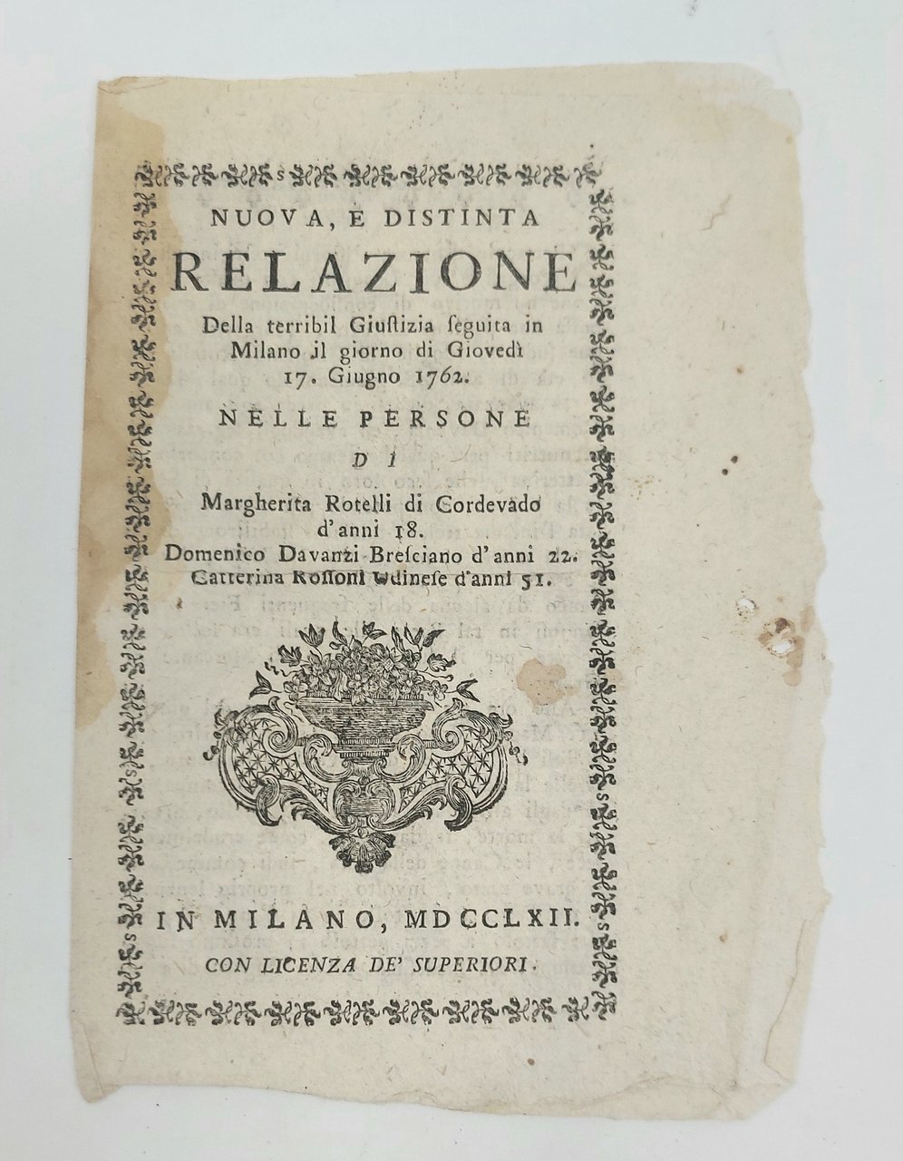 Nuova, e distinta relazione Della terribil Giustizia seguita in Milano il giorno di Giovedì 17 Giugno 1762. Nelle persone di Margherita Rotelli di Cordevado d'anni 18. Domenico Davanzi Bresciano d'anni 22. Caterina Rossoni Udinese d'anni 51.