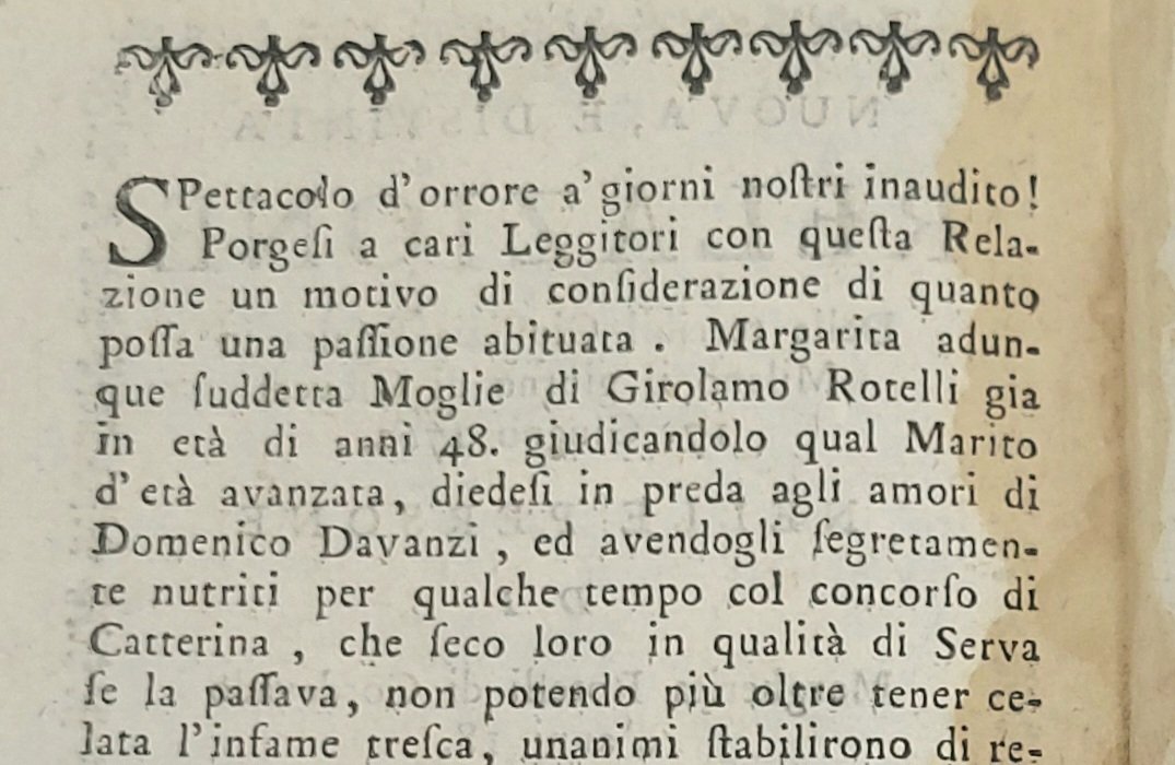 >in-8 picc (mm. 170x125), pp. 4. Frontespizio con cornice e fregio xilografico. Narra dell'efferato omicidio di Girolamo Rotelli di 48 anni, marito di Margherita: ''giudicandolo qual marito di età avanzata, diedesi in preda agli amori di Domenico Davanzi, ed avendogli segretamente nutriti con l'aiuto di Caterina, che seco loro in qualità di serva se la passava, non potendo più oltre tener celata l'infame tresca, unanimi stabilirono di recar morte al mentovato Girolamo...''. Trovati i resti della vittima ed individuati i colpevoli, la pena comminata fu impietosa e violenta quanto il delitto commesso: "fu prodotta su di essi la sentenza di morte, in guisa che fossero impiccati, fino che l'anime loro fossero separate da' Corpi, indi squartati col recare i quarti sulla strada di detto Luogo...". Rarissima edizione originale non censita dalle biblioteche italiane. Buon esemplare.