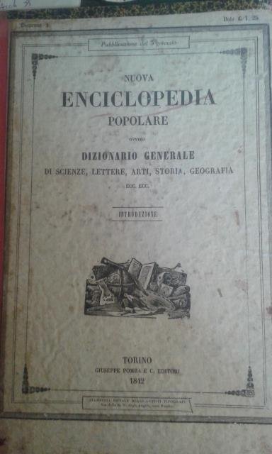 NUOVA ENCICLOPEDIA POPOLARE ovvero DIZIONARIO GENERALE DI SCIENZE, LETTERE, ARTI, STORIA, GEOGRAFIA, ECC. Opera compilata sulle migliori in tal genere, inglesi, tedesche e francesi, coll'assistenza e col consiglio di scienziati e letterati italiani". "Corredata di molte incisioni in legno inserite nel testo e di tavole in rame. 1841-1851.