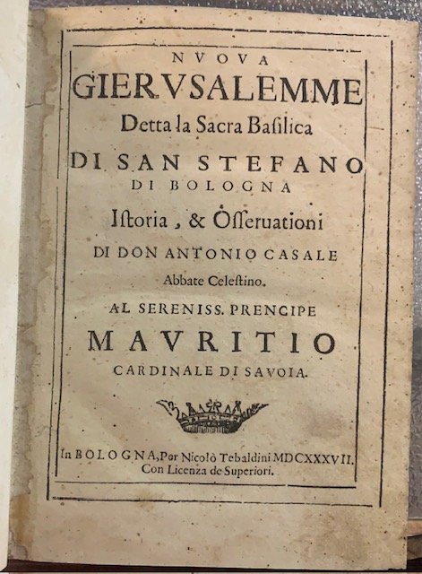 NUOVA GERUSALEMME DETTA LA SACRA BASILICA SI SAN STEFANO DI BOLOGNA. ISTORIA & OSSERVAZIONI di DON ABBATE CELESTINO, AL SERENISS. PRENCIPE MAURITIO CARDINALE DI SAVOIA., MDCXXXVII.
