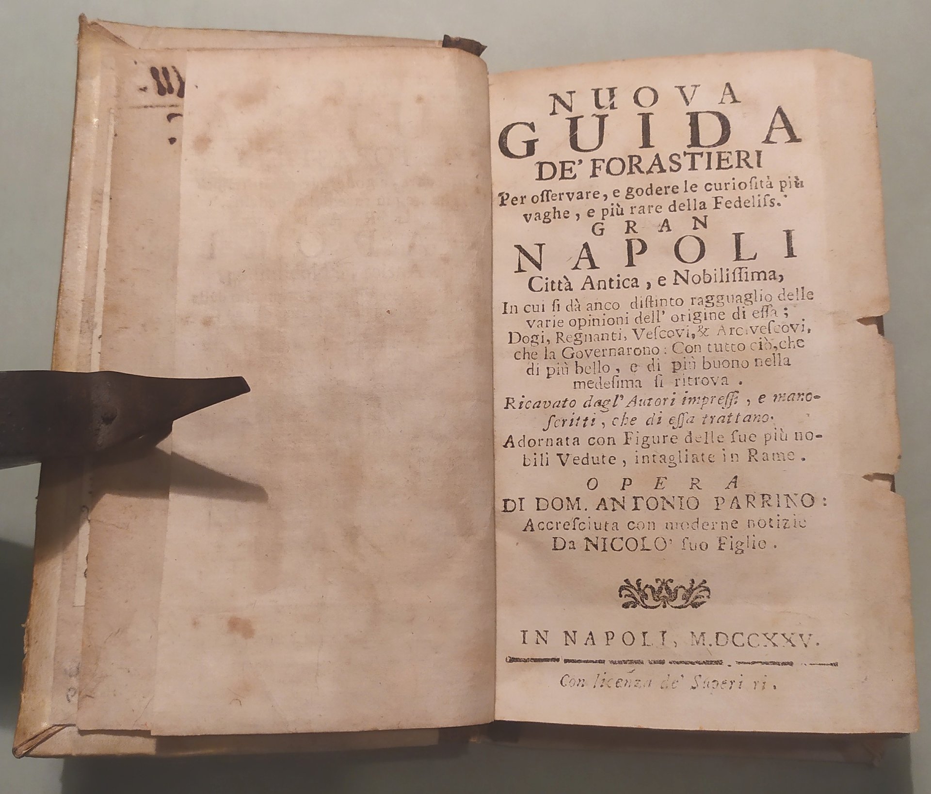 Nuova guida de' forastieri per osservare e godere le curiosità più vaghe e più rare della Fedeliss. Gran Napoli Città Antica e Nobilissima in cui si dà anco distinto ragguaglio delle varie opinioni dell’origine di essa: Dogi, Regnanti, Vescovi et Arcivescovi che la governarono. Adornata con figure delle sue più nobili vedute intagliate in rame.