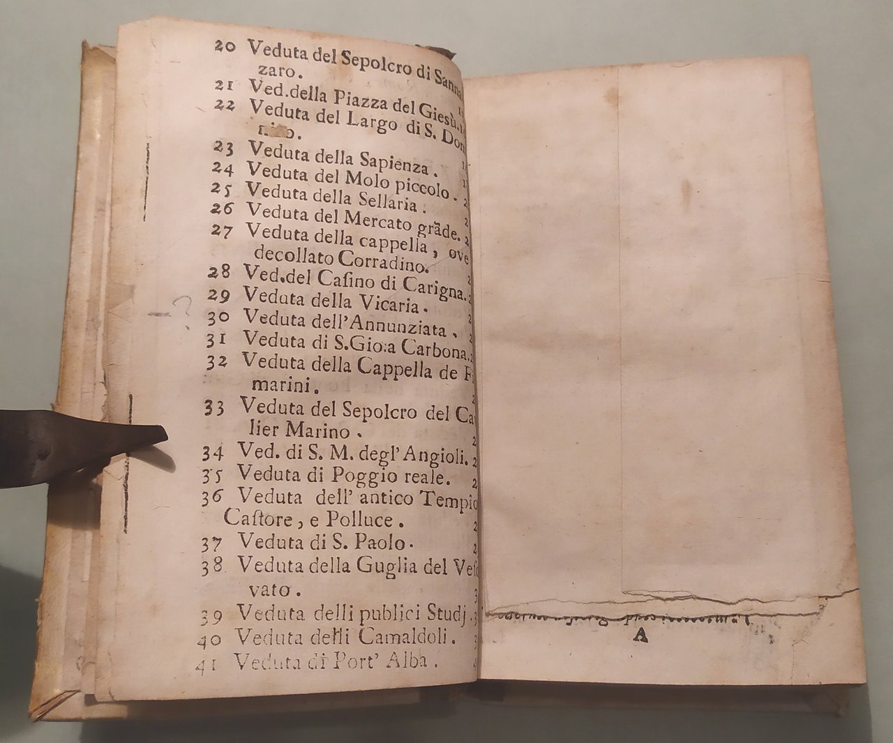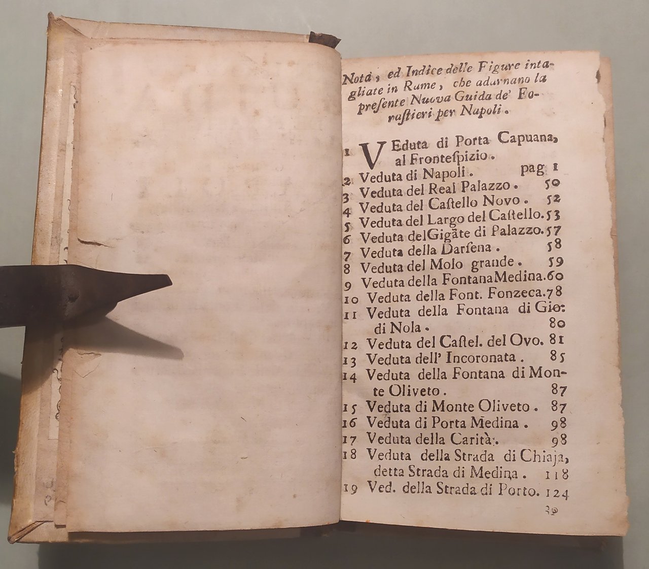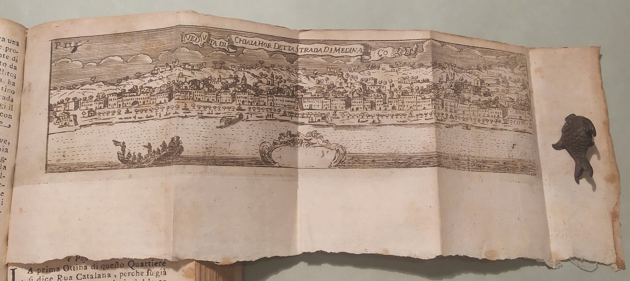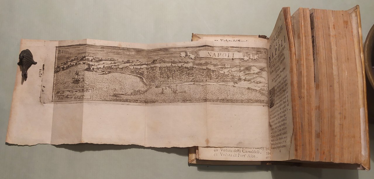 Napoli, 1725. In 16mo (cm.16x10); pp.4 n.nn., 409, 19 n.nn. con indice. 40 (su 41) tavole incise in rame, tra cui la veduta di Napoli a volo d'uccello e la veduta di Chiaia. Manca la tavola dell'Annunziata. Pergamena coeva, restauro al dorso. Ex libris. Lozzi 3056 cita edizione successiva; Fossati Bellani 3729. Raro.
