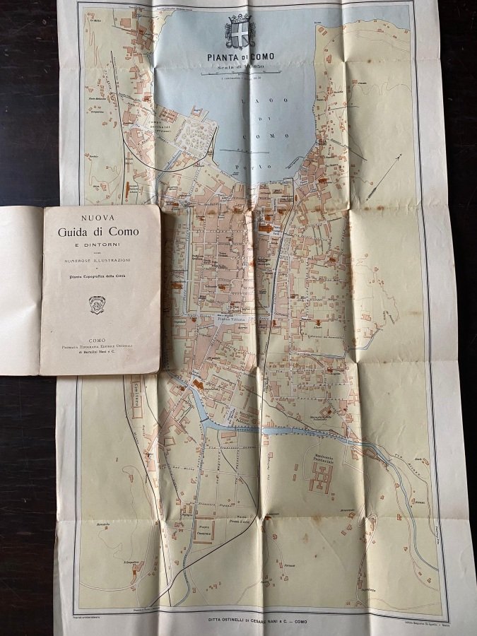 In-16° (cm. 14,8), brossura editoriale a stampa rossa con titolo in nero al dorso e al piatto anteriore (sbiaditi, minime tracce d'uso); pp. [8] 167 [3] in stato molto buono (lievi e sporadiche fioriture); con 1 grande carta topografica a colori più volte ripiegata fuori testo in fine, numerose illustrazioni in nero nel testo ed alcune tavole in fotolitografia fuori testo dei principali monumenti di Como. Edizione non comune di questa piccola guida comasca, pubblicata sempre in Como. Esemplare molto buono. (SJ3-vetr)