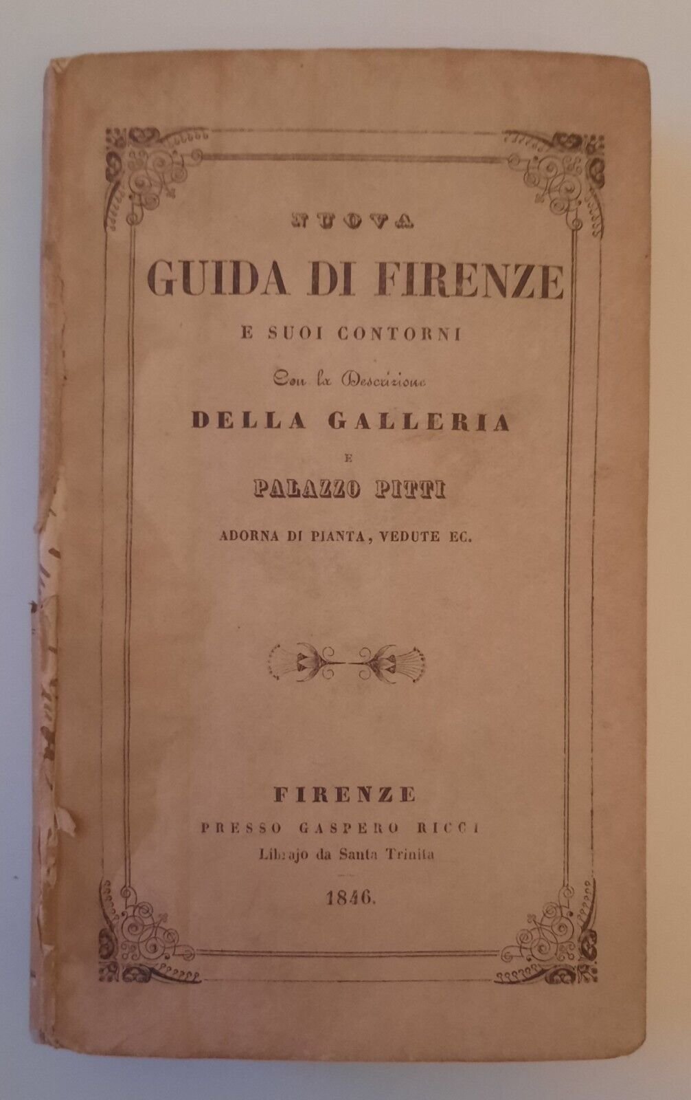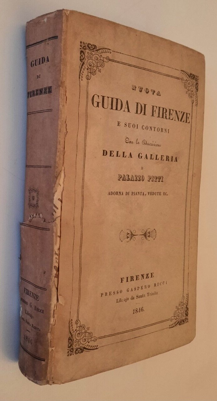 NUOVA GUIDA DI FIRENZE E SUOI CONTORNI FIRENZE PRESSO GASPERO RICCI 1846Cm. 18 x 11, pag. [4] 364 legatura editoriale, copertina illustrata, tavole in b/n alcune ripiegate.Lievi segni alla copertina strappo al dorso. Legatura solida, pagine fresche e pulite.