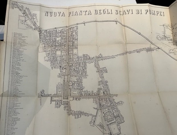 Pianta cm 71 x 50 circa, incisa in litografia, piu' volte ripiegata entro brossura in cartoncino cm 11,5 x 18 con etichetta applicata al piatto anteriore (danni riparati al dorso). Non e' presente la data di stampa ma un'indicazione manoscritta con grafia antica al piatto anteriore reca la data 1864. Pianta in litografia degli scavi di Pompei con una legenda di 95 voci, ristampata piu' volte nel corso della seconda meta' dell'800 adattandosi al procedere degli scavi, e con piccole varianti. L'incisore e' Vittorio Steeger.