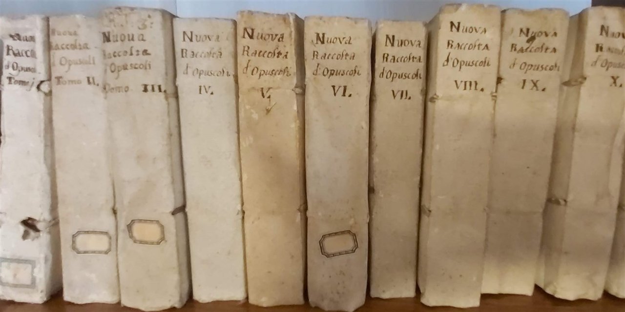 30 voll. in-16, leg. uniforme cartonato coevo con tit. mss ai d. Con alcune tavv. anche ripiegate. Si tratta dei primi 31 volumi da 1 a 32 (mancano vol. VI e vol. XI) sul totale dei 42 volumi pubblicati come continuazione alla "Raccolta di Opuscoli" del Padre Calogerà. I primi 14 sono curati ancora dal Calogerà, mentre i restanti dal suo successore Fortunato Mandelli. Contengono interess. studi di scienze e letterattura, con proprio occhietto e spesso con numerazione autonoma. Ottimo esempl. in barbe. [112]