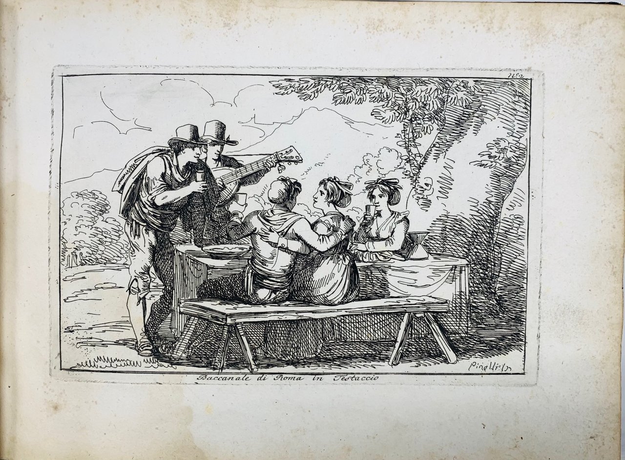>in-8 obl. (225x163 mm.), bella leg. coeva in marocchino blu scuro decor. con larga bordura in oro sui piatti, dorsi ornati, tagli dor. Titolo inc. (mancante) e 50 tavole. Aggiunte in fine 8 vedute inc di Tivoli e dintorni, sempre di Pinelli. Tiratura assai bella, ottima conservaz. sia delle incisioni sia della legatura d'amatore. Colas 2379. Vinet n.2306. Lipperheide 1264.