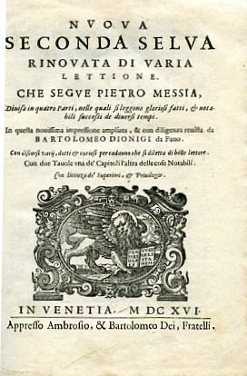 Nuova Seconda Selva rinovata di varia lettione che segue Pietro Messia, divisa in quattro parti, nelle quali si leggono gloriosi fatti, & notabili successi de diversi tempi. In questa novissima impressione ampliata, & con diligenza revista da Bartolomeo Dionigi da Fano. Con diversi varij, dotti & curiosi per cadauno che si diletta di belle lettere. Con due Tavole una de' Capitoli l'altra delle cose Notabili
