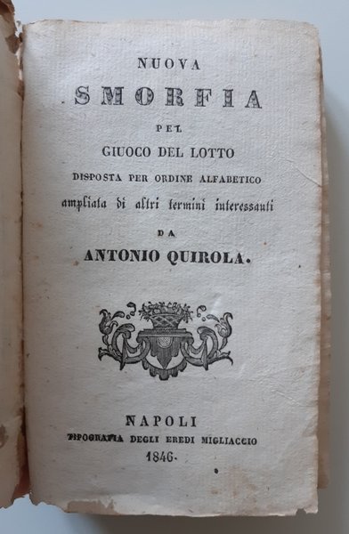 NUOVA SMORFIA PER GIUOCO DEL LOTTO DISPOSTA PER ORDINE ALFABETICO AMPLIATA DI ALTRI TERMINI INTERESSANTI DA ANTONIO QUIROLA NAPOLI TIPOGRAFIA DEGLI EREDI MIGLIACCIO 1846