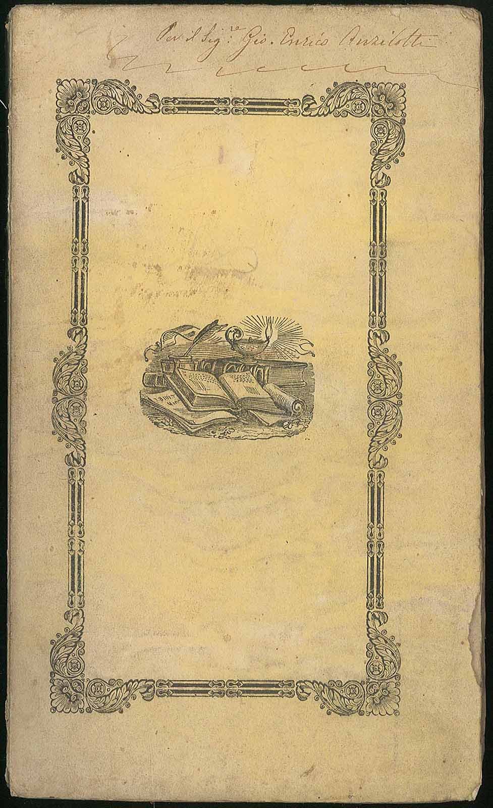 Philosophia viro prodest plurimum. Si religione imbutus sit animus. Lactant. Div. Istit. Lib. IV Cap. I. Volume unico, intonso, fioriture. Sgualcito all'esterno con usura da scaffale. Annotazione ad inchiostro in testa in copertina