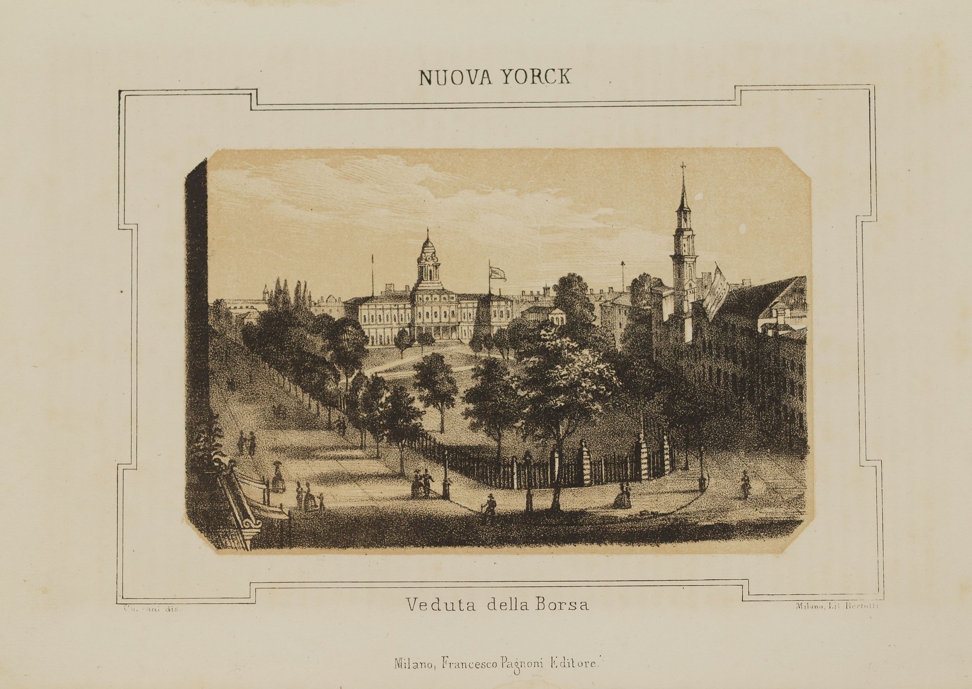 Bella veduta animata della Borsa di Wall Street a New York del 1860 circa. Autore: Bertotti Atlante: Meyer’s Universum 1838-1860 circa Data: 1860 circa Tecnica: Incisione su acciaio Dimensione della pagina: 17x25,5 cm Dimensione dell'incisione: 12,5x18 cm Condizioni. Buone. Alcune rare fioriture.Very beautiful view of Wall Street stock exchange in New York of 1860 circa. Date: 1860 circa Author: Bertotti Atlas: Meyer’s Universum 1838-1860 circa Technique: Lithography Leaf Dimension: 17x25,5 cm (6.7x10 inches) Engraving Dimension: 12,5x18 cm (4.9x7 inches) Conditions: Good conditions. Some foxings.