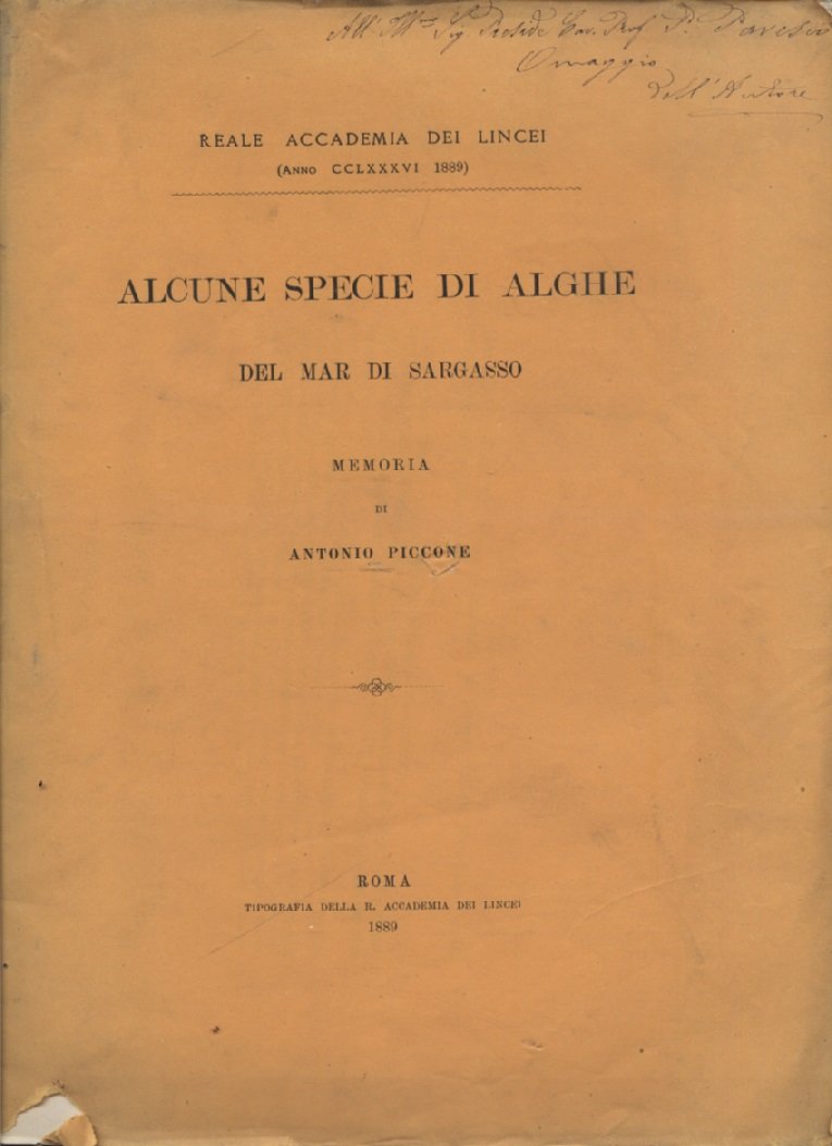 3 voll. in 4°, pp. 57; 18; 11. Brossure editoriali (con lievi ombre) a stampa. Dedica autografa dell'autore ai piatti di tutti e tre i volumi. Buono stato conservativo. Intonsi. Le Memorie del Piccone, soddisfanno a un debito contratto verso l'Accademia, giacchè il lavoro gli fu affidato dalla Commissione accademica incaricata di provvedere allo studio del materiale scientifico radunato dalle Regie Navi nei loro viaggi. Interessanti classificazioni scientifiche in base ai dati raccolti dalla crociera scientifica intorno al mondo della 'Vittor Pisani' nel 1882-'83. Estratti dalle Memorie dell'Accademia dei Lincei, Memorie della Classe di scienze fisiche, matematiche e naturali, vol. VI, anno CCLXXXVI, seduta del 3 febbraio 1889.