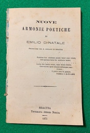 In 12°; 127, (1) pp. Senza brossura ma non slegato. Prima rara edizione di questa raccolta di componimenti poetici del poeta ed insegnante siracusano, Emilio di Natale, stampato a Siracusa da Andrea Norcia. A parte l'assenza della brossura l'opera si presenta in buone condizioni di conservazione.