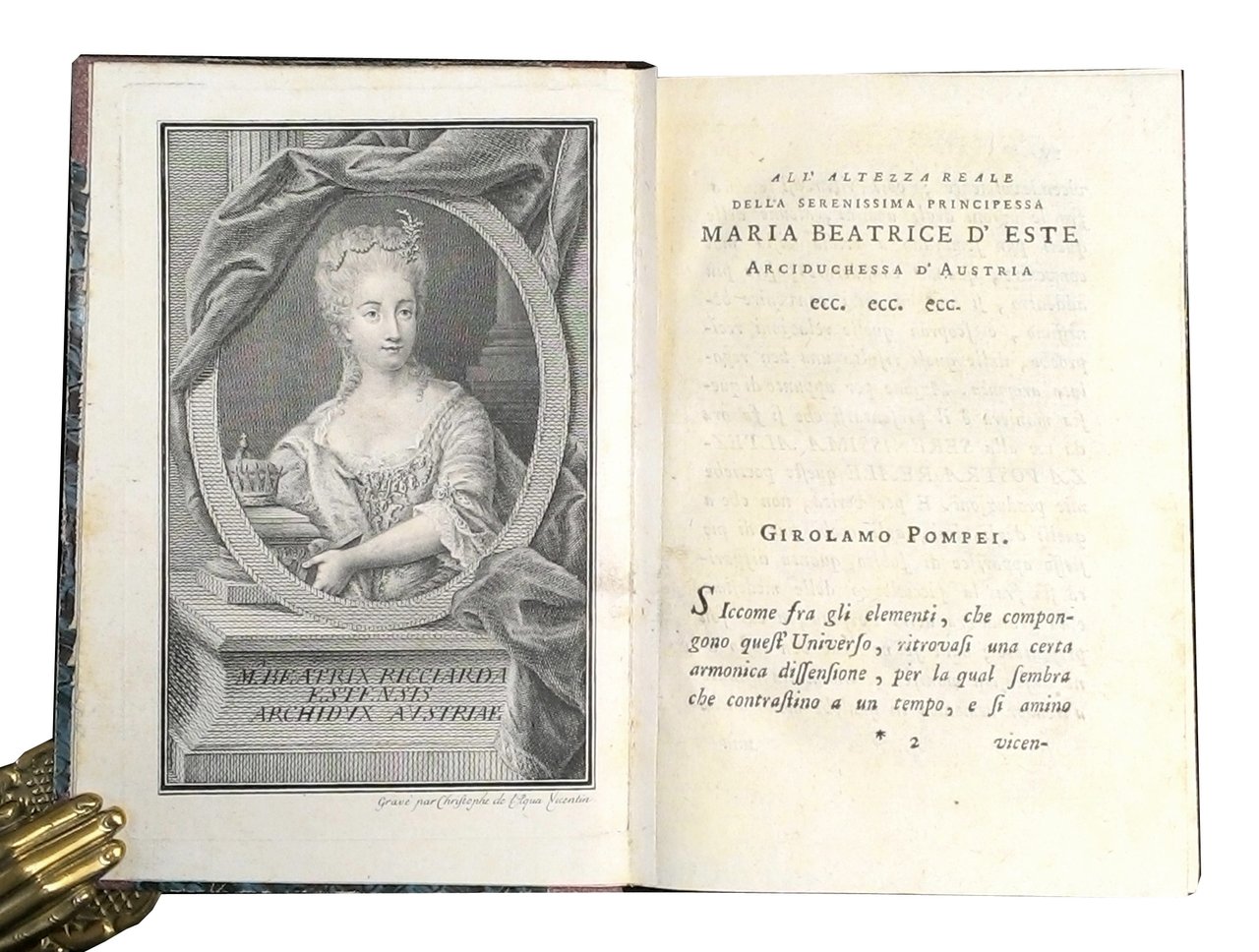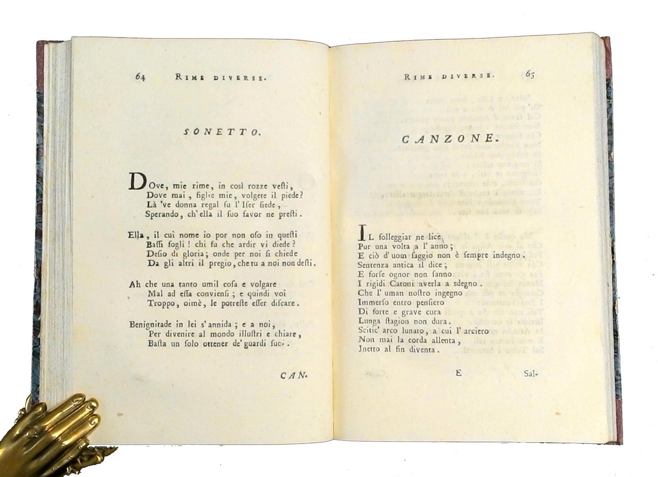 8vo (186x124 mm); leg. in mezza percalina dell'800 con angoli, carta marmorizzata ai piatti, dorso liscio con titolo a caratteri dorati, tagli colorati a spruzzo di azzurro; pp. XL, 228, (2 c. b.); front. a caratteri neri, bel ritratto dell'Arciduchessa d'Austria, Maria Beatrice d'Este (cui l'opera è dedicata), inciso in rame fuori testo (da Christophe de l'Aqua, vicentino), legato subito dopo il frontespizio. Edizione originale, poco diffusa, di questa raccolta dei componimenti poetici del Pompei, cui seguono le sue traduzioni di Epigrammi dal greco accompagnate dal testo originale. Gamba cita la raccolta delle Opere di Girolamo Pompei, comprese le Canzoni Pastorali che "tengono distinto seggio nel Parnaso Italiano". Girolamo Pompei (1731-1788), scrittore veronese, autore di rime, tragedie, dissertazioni morali e letterarie, fu noto principalmente per il volgarizzamento nel 1772 delle "Vite parallele" di Plutarco. Prov.: Indicazione d'appartenenza su etichetta ex libris incollata al contropiatto ant., a nome Umberto Calamida. Rif.: IT\ICCU\RAVE\013722. OCLC, 797740261. Cond.: Lievi tracce d'uso alla legatura; opera in condizioni generali molto buone. -- ORIGINAL EDITION OF A COLLECTION OF POEMS OF GIROLAMO POMPEI, FOLLOWED BY HIS TRANSLATIONS OF GREEK EPIGRAMS. Light traces of use. Copy in very good condition.