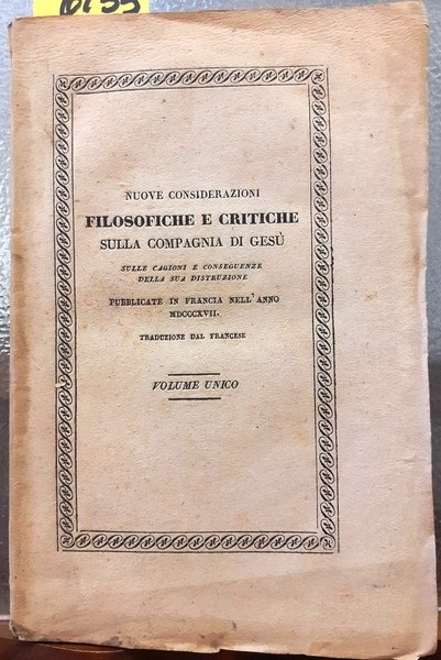 NUOVE CONSIDERAZIONI FILOSOFICHE E CRITICHE SULLA COMPAGNIA DI GESU' SULLE CAGIONI E CONSEGUENZE DELLA SUA DISTRUZIONE PUBBLICATE IN FRANCIA NEL 1817. Traduzione dal francese dedicata a S. IGNAZIO DA LOYOLA dal sacerdote GIOACHINO PEDRELLI Romano.