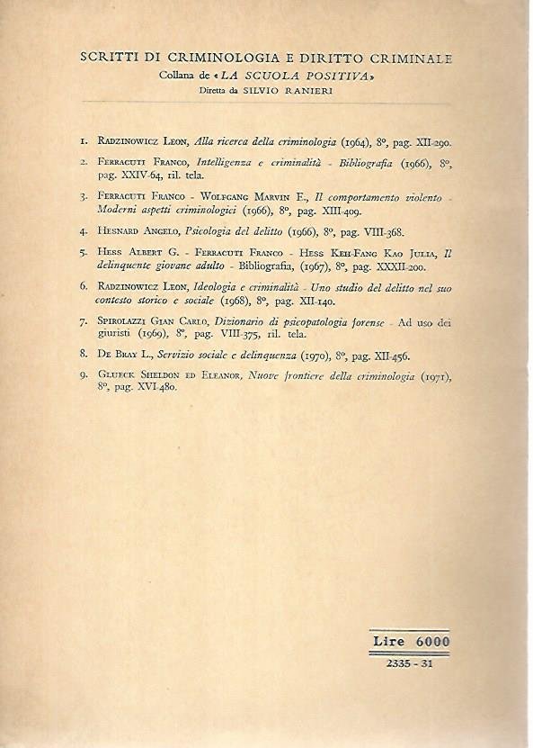 Pagine testo: ingiallite, brunite ai margini. Copertina: in brossura, sporca lievemente, brunita. Interno in ottime condizioni.Collana Scritti di criminologia e diritto criminale. Buono (Good) .
