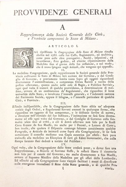 In-4 p. (mm. 296x220), cartoncino muto antico, 17 cc.nn. Il testo di queste Risoluzioni contiene 56 articoli per gli oggetti di interesse generale, comune a tutte le città e provincie dello Stato e 63 articoli per il particolare delle singole città (Milano, Pavia, Cremona, Lodi, Como, Casalmaggiore e le Terre Separate, cioè Soncino, Fontanella, Pizzighettone, Castelleone). Mancanza margin. all'ultima carta, altrimenti ben conservato.