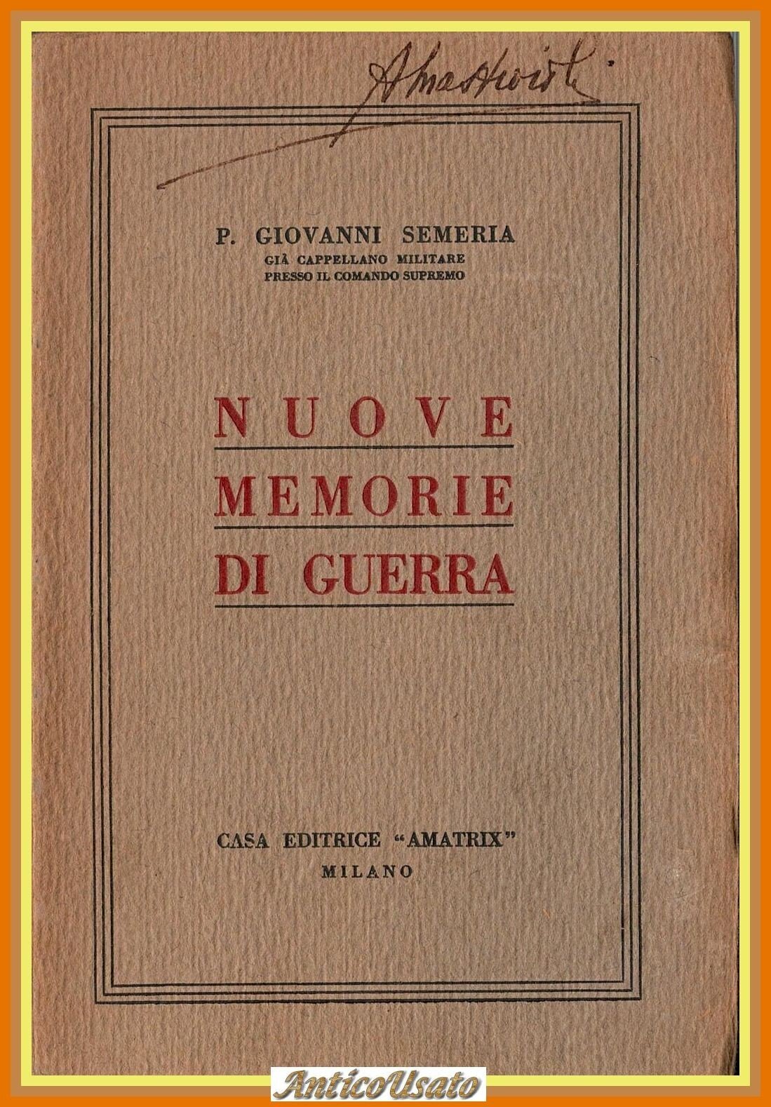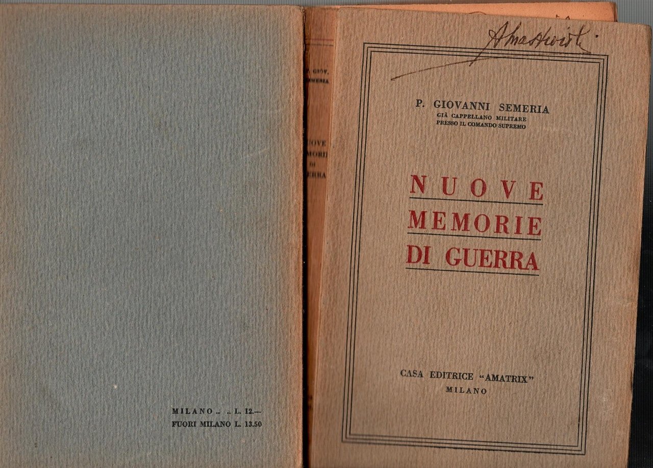 NUOVE MEMORIE DI GUERRA di Padre Giovanni Semeria. Amatrix Editore, forse 1928. 192 pagine. Copertina editoriale in brossura. Stato di conservazione: molto buono (pagine normalmente ingiallite, firma di appartenenza) Libro usato saggistica prima guerra mondiale I