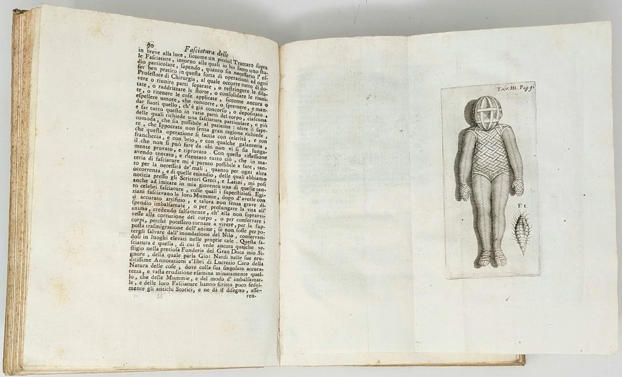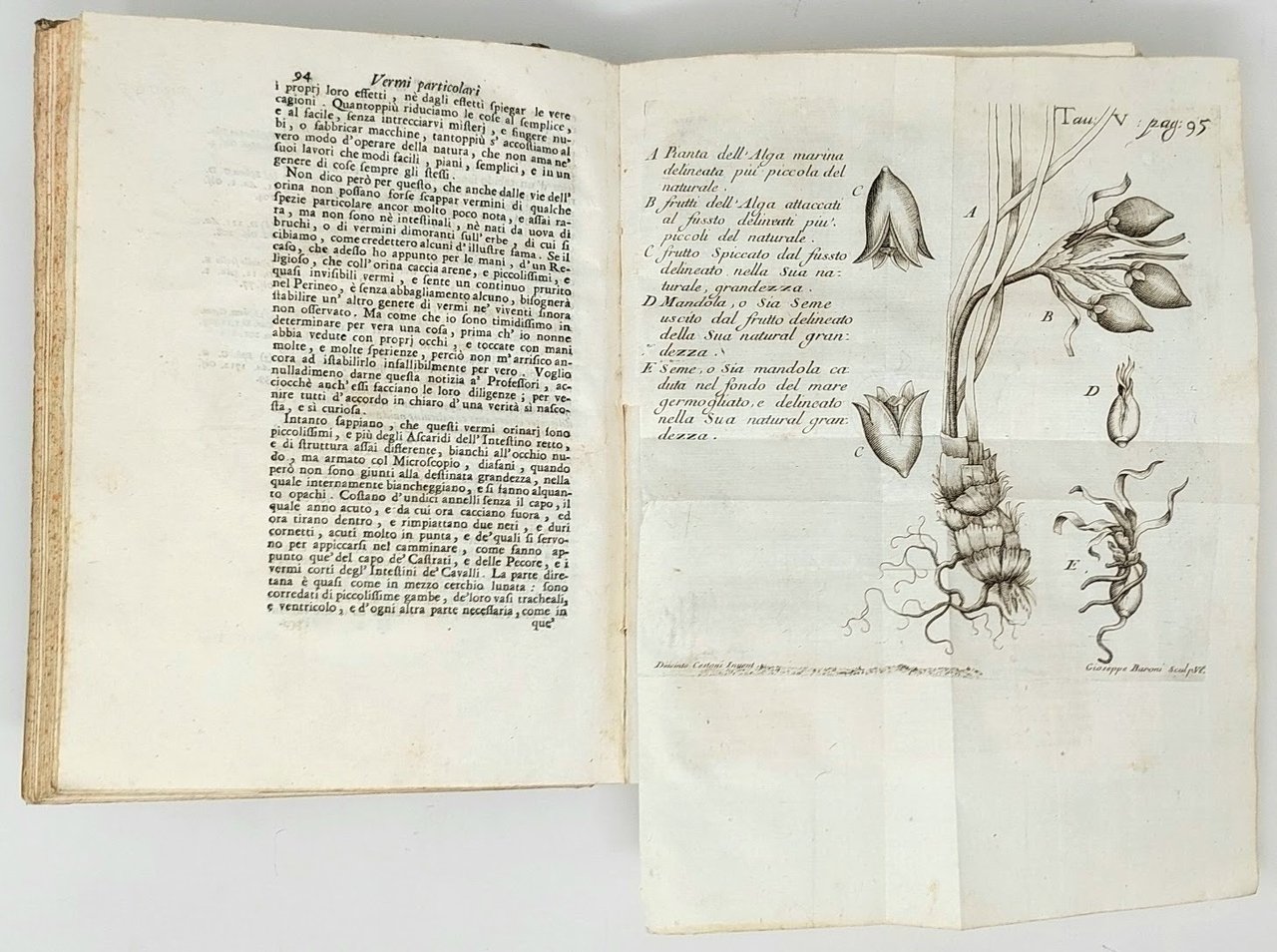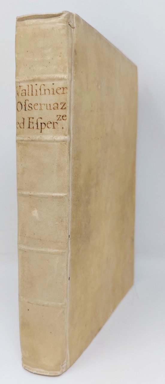 >2 opere in un vol. in-4, pp. (16), 184; (12), 232. Legatura coeva piena pergamena, titolo ms. al dorso. Con complessive 15 tavole incise in rame f.t. (10 nella prima opera e 5 nella seconda; secondo Sabia dovrebbero essere rispettivamente 3 e 12). Prima edizione di entrambe le opere, delle quali il Sabia (Opere di A. Vallisneri, nn. 97 e 98) afferma: «(la prima) è un importante saggio sulla parassitologia, con interessanti osservazioni sui vermi esistenti nel corpo umano: Vallisneri continua la descrizione delle varie sue scoperte intorno alle uova di vermi che alloggiano nel tubo gastroenterico di animali. Parla di un nuovo liquore da schizzare dentro i vasi corporei, per rintracciarne le varie diramazioni. Cita la storia di una fanciulla nata senza cranio e con un pezzo di carne al posto del cervello. (Nella seconda) l'autore tratta della mosca dei rosai, e lancia un'idea nuova sulla divisione generale degli insetti, sul loro modo di nascere. Parla della nascita della pulce, dall'uovo ai suoi sviluppi. Parla dei vermi delle pecore, dei montoni, delle capre, dei daini e dei cervi, e alla fine tratta dell'estro dei buoi e traccia l'anatomia dello struzzo». Lo stesso Sabia ci fa sapere che "questa edizione vallisneriana (delle "Nuove osservazioni, ed esperienze") fu esaurita alla vendita, per cui fu ristampata nel 1726 con la Giunta di lettere medico-fisiche" Importante assieme di due opere scientifiche del grande medico e naturalista reggiano (1661-1730). Ottimo esemplare. Cat. Vinciana n. 1770.