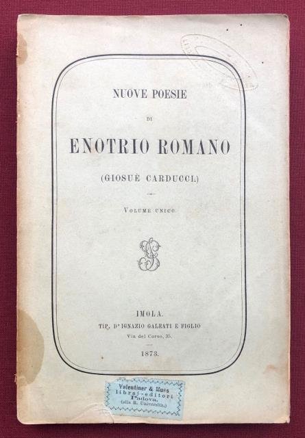 Volume Unico. Imola, Tip. D'Ignazio Galeati e Figlio, 1873. In 8vo, pp. 132 (con Note e Indice), bross. orig. in carta verdina, timbro a secco (non più leggibile) ed etichetta alla copertina anteriore “Libreria Valentiner & Mues libraj - editori Padova (alla R. Università)”, al contropiatto coeva scritta di appartenenza “20 Marzo 1874 Padova” seguito da una serie di iniziali. Prima originale e rara edizione, stampata a Imola, di questa raccolta di poesie del poeta Giosuè Carducci. Enotrio è un nome di tradizione letteraria che godette di scarsa diffusione. Il Carducci utilizzò questo pseudonimo di “Enotrio Romano” per firmare le sue opere giovanili e trasse questo nome da “Enotria”, una antica regione dell'Italia meridionale, con il significato di “abitante dell'Enotria” Brevi mancanze della carta agli estremi del dorso e di conseguenza allentato, un alone alla copertina anteriore e una macchietta di inchiostro a quella anteriore, alcune pagine sono lievemente ingiallite, ottimo l'interno.