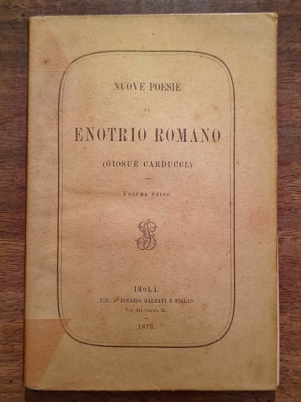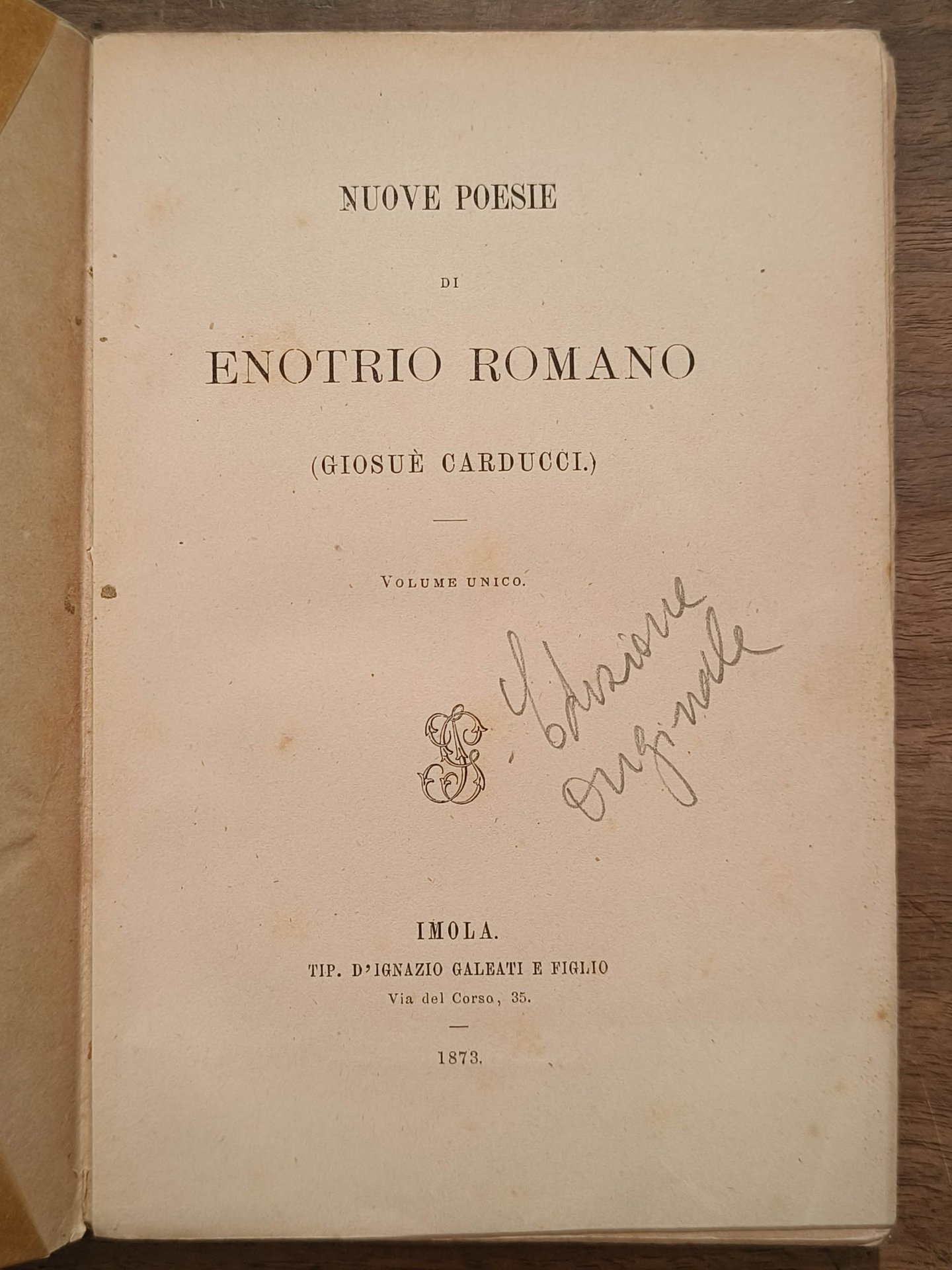 Nuove poesie, Imola, Tipografia d'Ignazio e figlio, 1873. Prima edizione della quarta raccolta di poesie di Carducci, contenente poesie mai apparse nelle precedenti raccolte. Cm 19. Pp. (4) 132. Brossura editoriale verde. Volume complessivamente in buono stato.