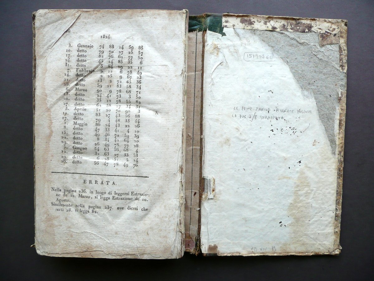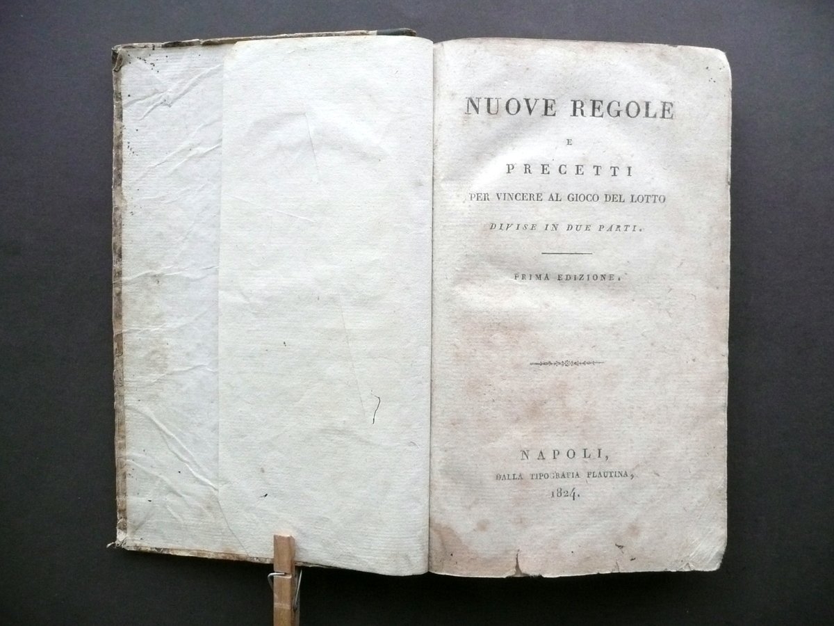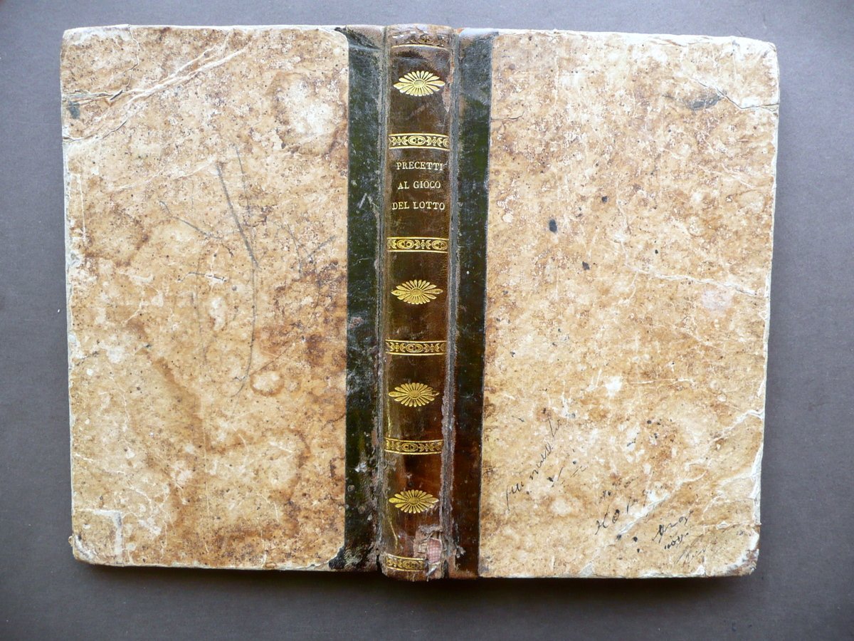 Nuove regole e precetti per vincere al gioco del lotto divise in due parti prima edizione Dalla Tipografia Flautina, Napoli 1824; cm 20,5x12,5; pp. 8-280, con alcune figure e tavole in b/n fuori t.; legatura d'epoca in mezza pelle con titolo e fregi impressi in oro al dorso. Condizioni di conservazione Esemplare in condizioni più che discrete con tracce d'uso e del tempo; coperta con alcune irregolarità, piccole abrasioni e mancanze, qualche leggera ombra di gora le quali interessano marginalmente e leggermente anche alcune pagine senza mai coinvolgere il testo (vedi foto); piatti con leggeri accenni di pieghe agli angoli e con qualche traccia di vecchia annotazione - segnetto. Interni con alcune leggere bruniture; margini e angoli di qualche pagina con pochi piccoli / minimi strappetti e/o difetti; risguardo ant. rifilato al margine est.; pp. 7-8 della prima sezione posposte (precedono le pp. 5-6, vedi foto); pp. 7-8 della seconda sezione parzialmente mancanti (vedi foto). Cerniera int. post. fessurata con conseguente distacco del dorso dal corpo del testo, ma interni compatti. Esemplare molto raro. SETT131.L13138 N P