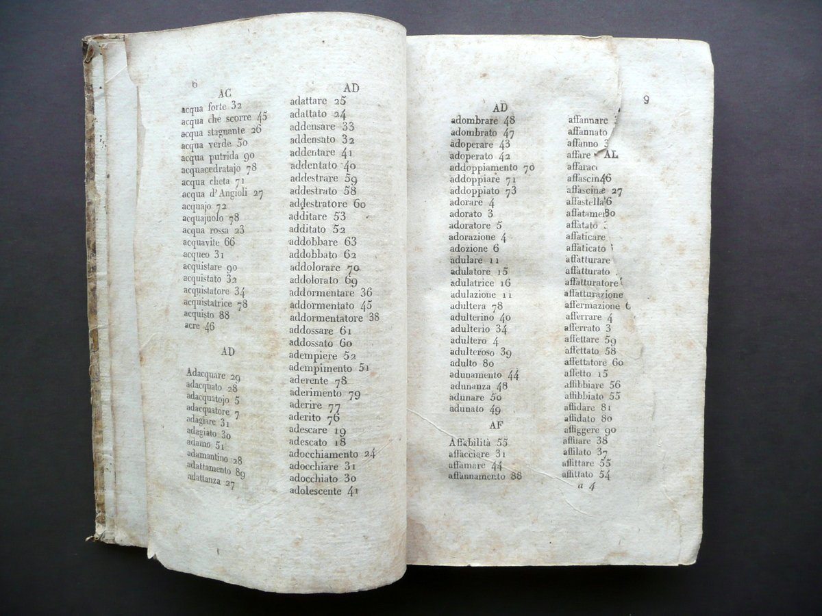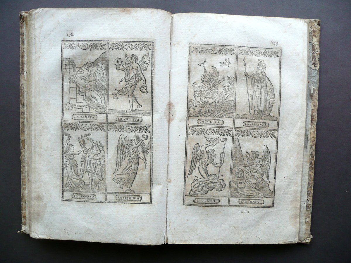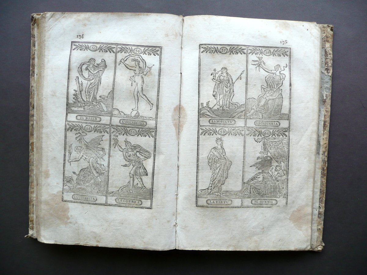 Nuove regole e precetti per vincere al gioco del lotto divise in due parti prima edizione Dalla Tipografia Flautina, Napoli 1824; cm 20,5x12,5; pp. 8-280, con alcune figure e tavole in b/n fuori t.; legatura d'epoca in mezza pelle con titolo e fregi impressi in oro al dorso. Condizioni di conservazione Esemplare in condizioni più che discrete con tracce d'uso e del tempo; coperta con alcune irregolarità, piccole abrasioni e mancanze, qualche leggera ombra di gora le quali interessano marginalmente e leggermente anche alcune pagine senza mai coinvolgere il testo (vedi foto); piatti con leggeri accenni di pieghe agli angoli e con qualche traccia di vecchia annotazione - segnetto. Interni con alcune leggere bruniture; margini e angoli di qualche pagina con pochi piccoli / minimi strappetti e/o difetti; risguardo ant. rifilato al margine est.; pp. 7-8 della prima sezione posposte (precedono le pp. 5-6, vedi foto); pp. 7-8 della seconda sezione parzialmente mancanti (vedi foto). Cerniera int. post. fessurata con conseguente distacco del dorso dal corpo del testo, ma interni compatti. Esemplare molto raro. SETT131.L13138 N P