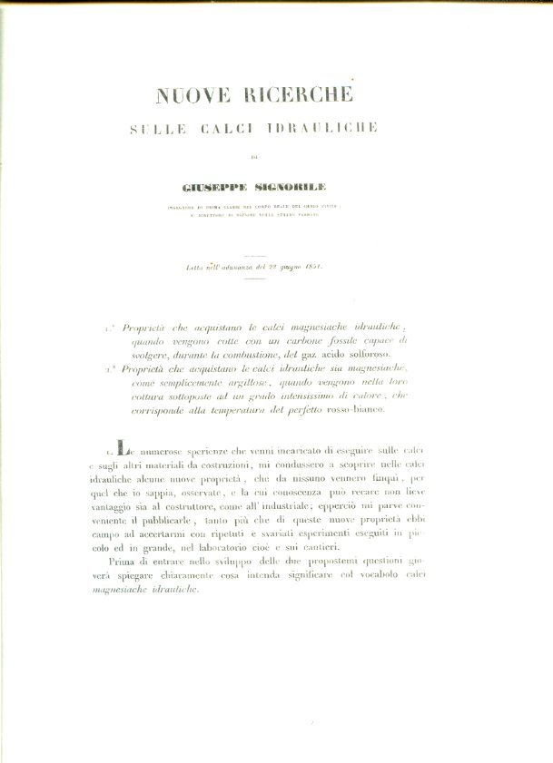 In-4°, pp. 243-266, privo di brossura. Ottimo stato. Estratto dalle 'Memorie della R. Accademia delle Scienze di Torino', serie 2., tomo XIII. Cenni sulle proprietà che acquistano le calci magnesiache idrauliche una volta cotte con un carbon fossile capace di svolgere, durante la combustione, dell'acido solforoso.