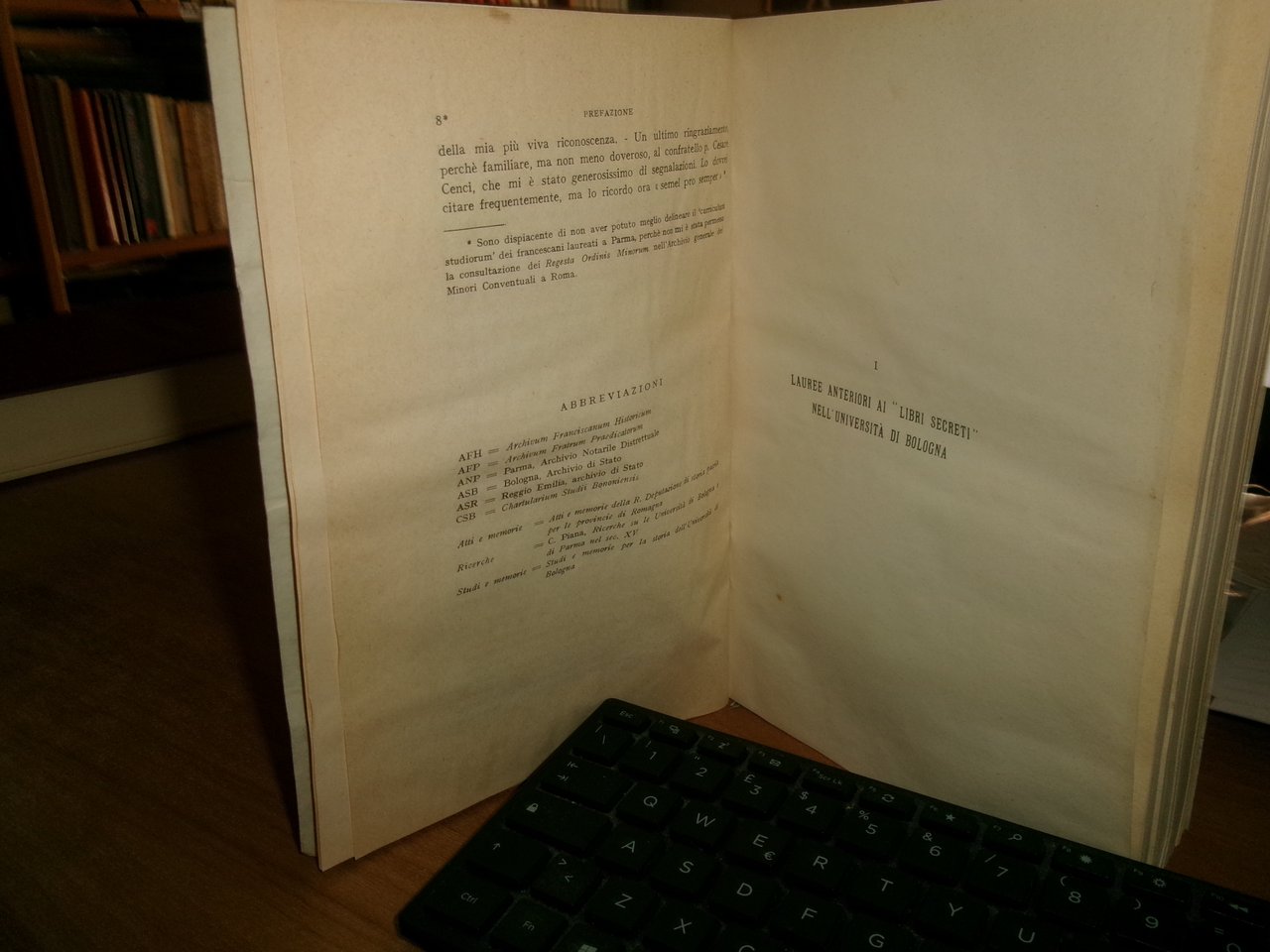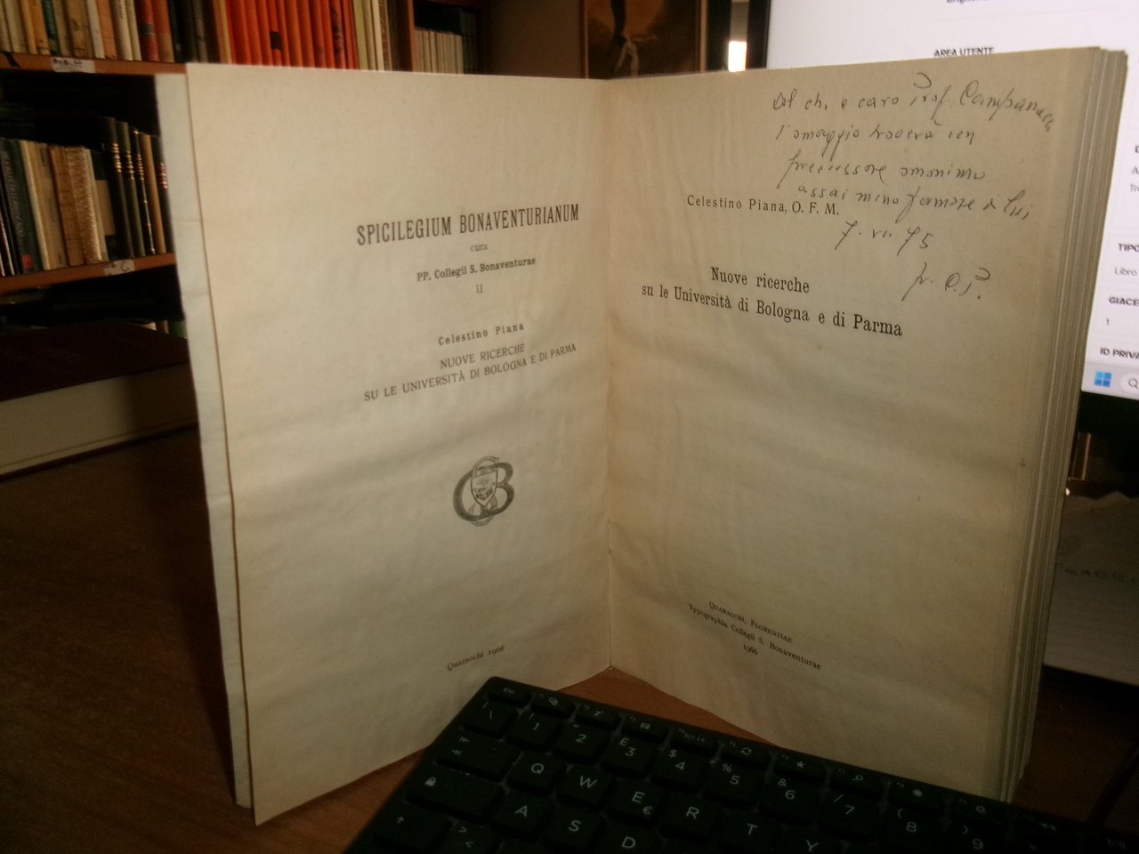 NUOVE RICERCHE UNIVERSITÀ DI BOLOGNA E DI PARMA (Celestino Piana). Florentiae, Typographia Collegii S. Bonaventurae (Quaracchi), 1966. In-8°, br. edit. 650 pp. Lievi segni del tempo ma ottimamente conservato con dedica dell' Autore nel frontespizio. Strappo riparato con scotch nell' indice generale. Uff. C - III - 6
