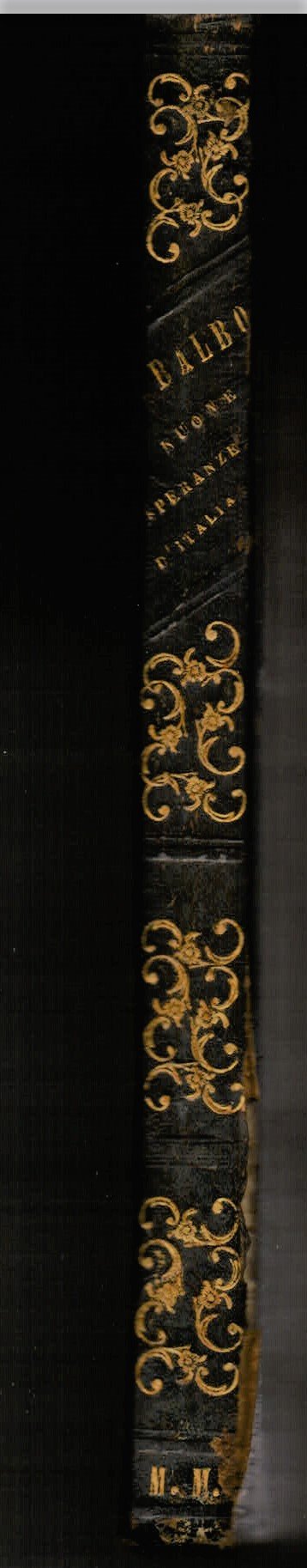 In-8°, pp. 295, legatura del tempo m. pelle con titolo impresso longtudinalmente in oro e motivi floreali egualmente in oro al dorso. Piatti in tela rossa decorata con girali vegetali a freddo. Buon esemplare. Prima edizione, postuma. L'opera fa seguito alle 'Speranze d'Italia', fra le più celebri della pubblicistica risorgimentale che influenzò profondamente un'intera generazione di patrioti e il cattolicesimo liberale del nostro Ottocento, a dispetto della messa al bando del libro sia da parte della polizia austriaca che di quella pontificia.