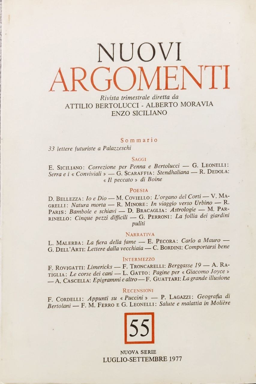 NUOVI ARGOMENTI. Rivista trimestrale diretta da Attilio Bertolucci-Alberto Moravia-Enzo Siciliana., n. 55. Luglio-Settembre. Scritti di : Enzo SICILIANO-Dario BELLEZZA-Luigi MALERBA -F. ROVIGATTI-Franco CORDELLI, ecc.