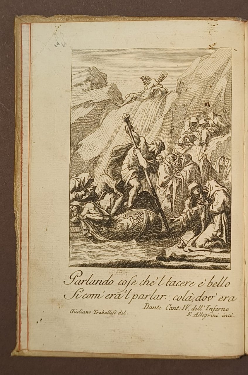 Legatura in piena pergamena, al dorso tassello in pelle con titolo. Lievi segni d'usura, mancanza al bordo inferiore esterno di entrambi i piatti. Tagli in rosso. Antiporta figurata con un passo della Commedia (Giuliano Traballesi des. F. Allegrini inci.). Pubblicazione clandestina in "Cosmopoli".