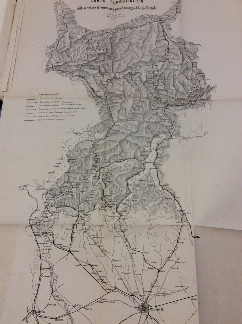 In-4 gr. (mm. 372x261), brossura originale (picc. manc. e lievi strappetti marginali ai piatti), pp. (4),163,XXIV,(2), con 9 grandi tavv. f.t., più volte ripieg., relative a: "Prospetto comparativo dei grandi trafori proponibili per le Alpi Elvetiche Orientali.. - Profili di massima comparativi fra le varie linee di ferrovie progettate pel passaggio delle Alpi Elvetiche Orientali ed Occidentali (6 tavv.) - Carta corografica delle varie Linee di Ferrovie progettate pel passaggio delle Alpi Elvetiche - Carta generale delle strade ferrate dal Mediterraneo alla Svizzera".L'opera contiene: "Relazioni degli autori dei progetti medesimi, A. Vanotti, G. Antonini, G. Vanossi, G. Bellini sulle condizioni tecniche ed economiche dei tracciati studiati in confronto anche colle linee agli altri varchi Alpini - Relazione di Giovanni Omboni sulle condizioni Geologiche delle Valli che conducono ai varchi dello Spluga e del Septimer". Testo con lievi fioriture marginali, altrimenti ben conservato, intonso.