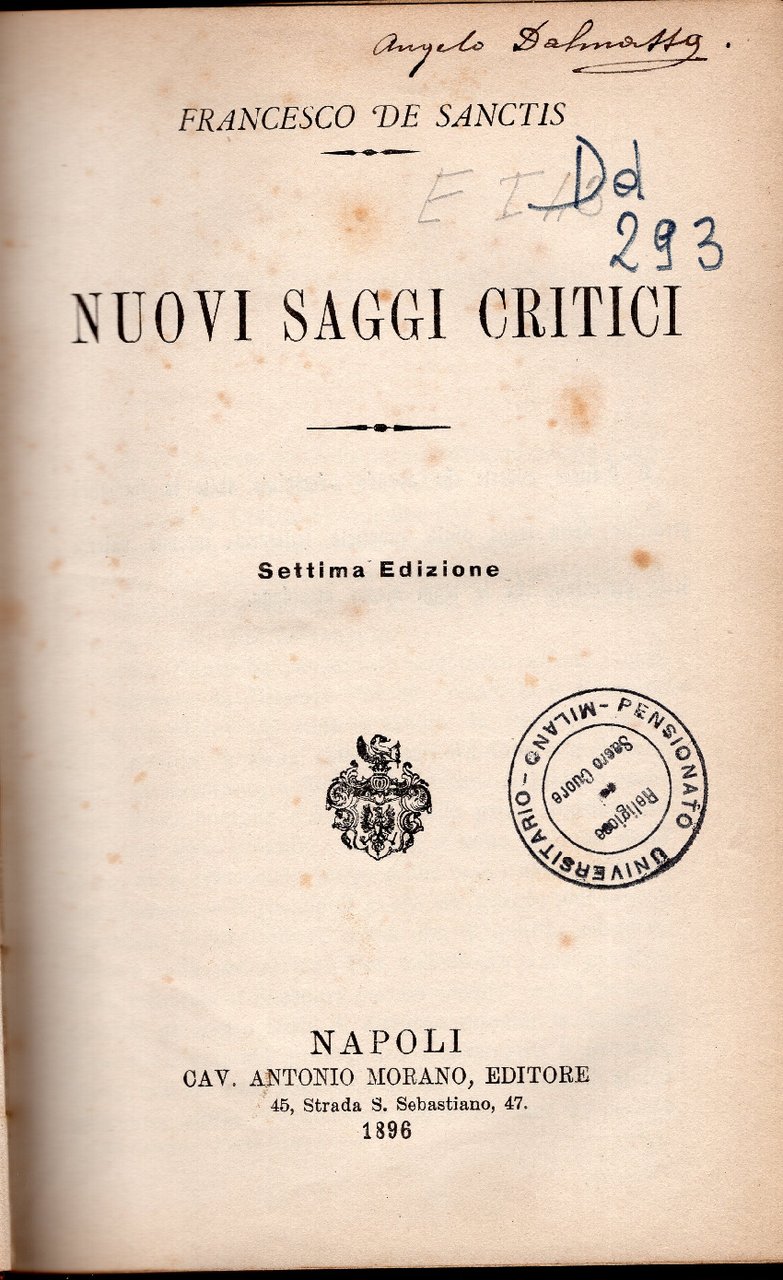In 8, pp. 525, rilegatura coeva in mezza pelle con titolo e decorazioni in oro al dorso, etichetta cartacea al dorso. Timbro "Pensionato Universitario Milano", sigla e firma di possesso al frontespizio. Settima edizione. Ben tenuto. in ottavo Buono (Good) .