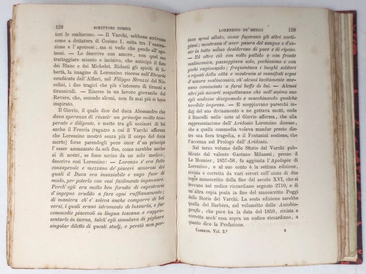 >4 volumi in-8, pp. 322, 386, 276, 232, legatura d'amatore in mezzo marocchino rosso, dorsi a nervi con titoli in oro, brossure editoriali conservate. Testi e dotte critiche letterarie su varie decine di scrittori italiani e stranieri, dal Medioevo al XIXmo secolo. Esemplare assai bello.