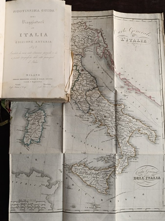 In-16° (cm. 18), legatura coeva in mezza pelle con titolo e fregi in oro al dorso liscio, piatti in tela (lievi tracce d'uso), tagli spruzzati in blu, risguardi marmorizzati; pp. [4] XXIV 436 in barbe, in stato molto buono; con frontespizio inciso in rame e 24 carte geografiche in rame più volte ripiegate fuori testo, tra cui 14 belle piante topografiche ed 1 grande carta generale dell'Italia a colori in fine; gora marginale alle sole prime carte, lievi fioriture sparse, ossidazioni a 2 carte (trascurabili difetti). Bella e non comune edizione di questa celebre guida curata da Artaria, strumento indispensabile per i viaggiatori in Italia nel primo Ottocento. Cfr. Cremonini 111. Buon esemplare. (SD4)