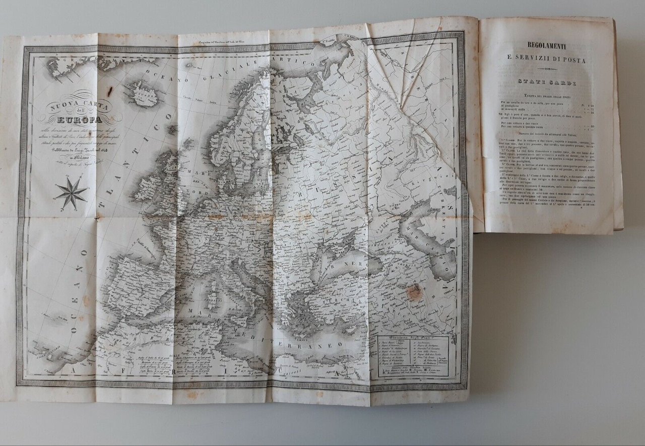 Segni, abrasioni e piccolissime mancanze alla copertina, piccoli strappi alle carte ripiegate e rottura della carta