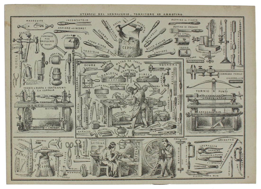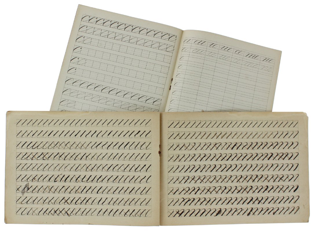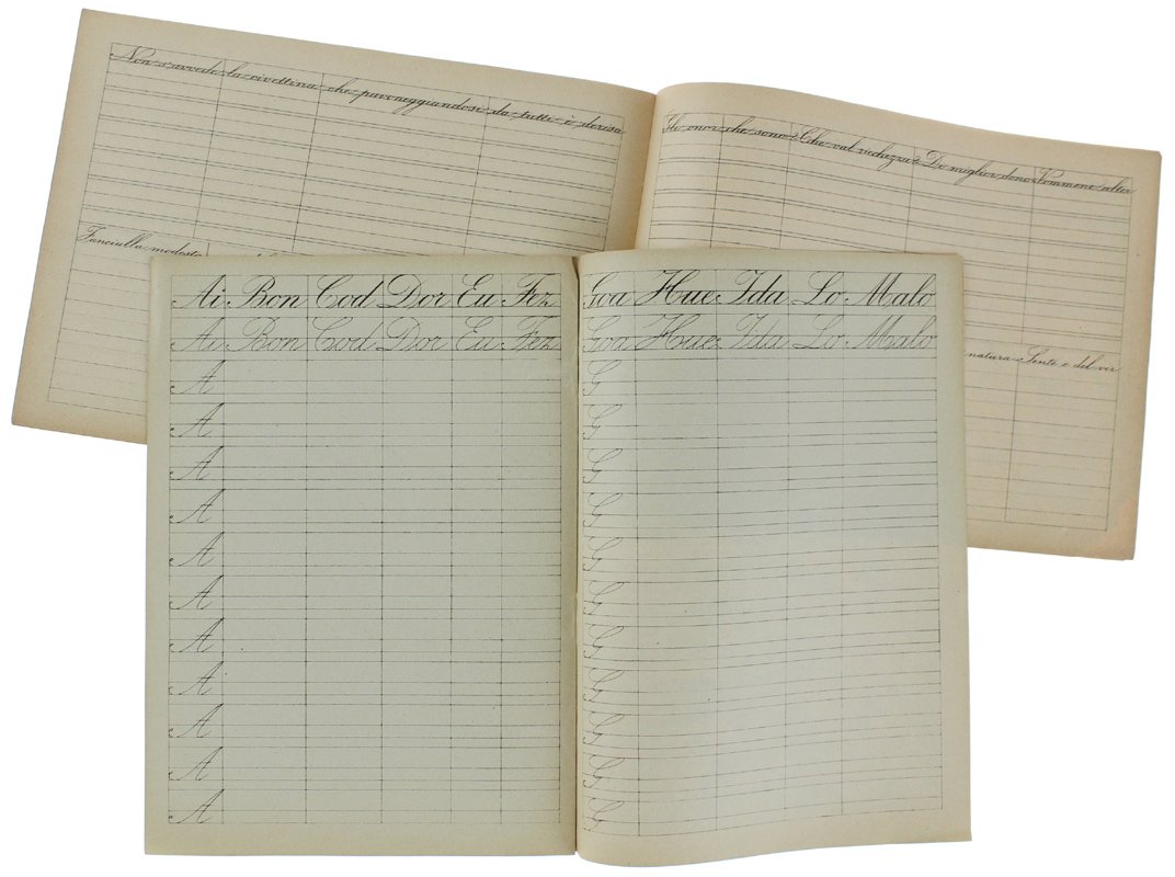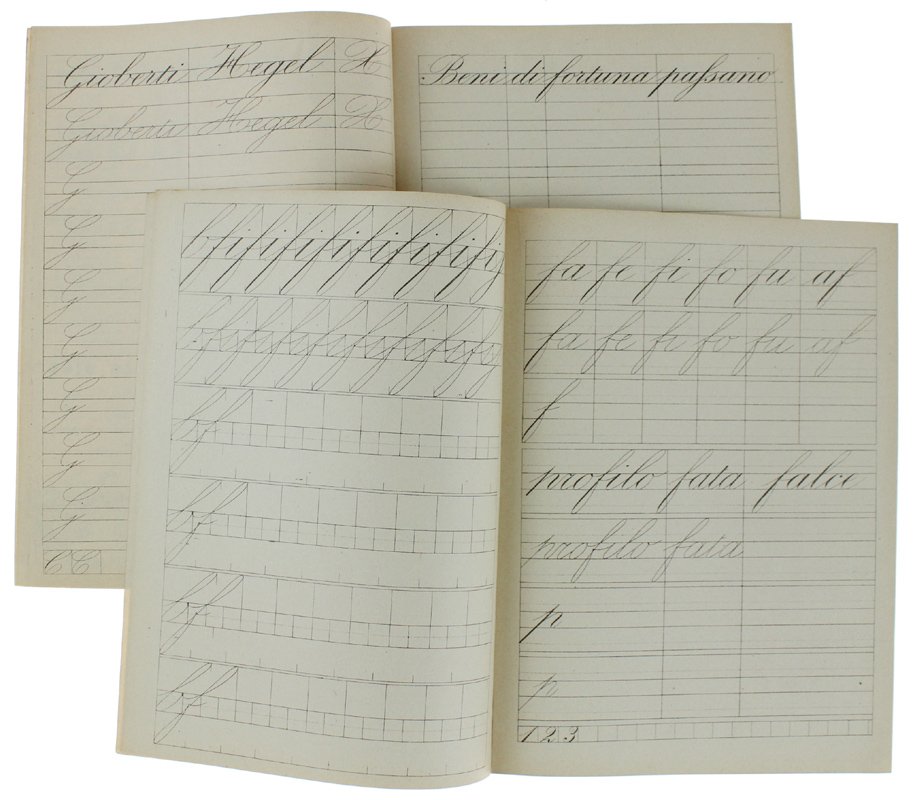 (Codice GI/0001) Corso completo di calligrafia: otto quaderni di esercizi progressivi, con modelli a stampa. Tutti in 8° (22x16 cm), 16 pagine comprese copertine. Il primo quaderno è tutto compilato a penna, i seguenti sono quasi interamente in bianco. Brossure editoriali figurate; le copertine posteriori sono illustrate con numerosissime fini incisioni di oggetti e relativa precisa terminologia (cucina, officina del fabbro e del falegname, casa di campagna, pianta e sue part - geografia fisica, muratore, abiti e ornamenti, mobili e arredi). Tracce d'uso al 1° quaderno, gli altri in ottimo stato. RARA RACCOLTA. ~~~ SPEDIZIONE IN ITALIA SEMPRE TRACCIATA