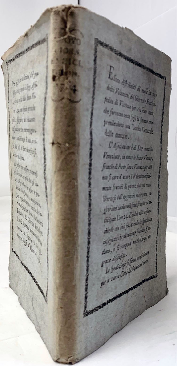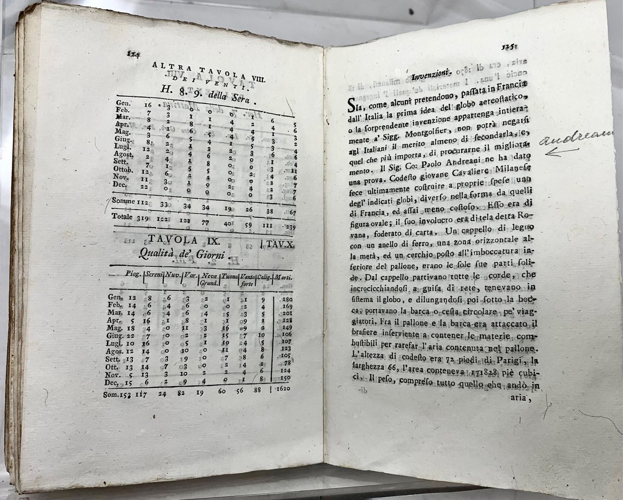 >in- 8° (mm. 194x127), pp. 228, brossura editoriale con titolo al dorso e testo a stampa entro bordura inciso sui due piatti. Da pagina 41 a pagina 50 il giornale è dedicato al volo di Montgolfier del 1783: "Descrizione dele sperienze della macchina aerostatica de' Sigg. Montgolfier, e di quelle alle quali la loro scoperta ha dato motivo. Del Sig. Faujas di St Fond..."; da pag. 125 tratta ampiamente della prima impresa dell'Andreani, comprende una meticolosa descrizione del suo aerostato e delle sue prime esperienze di volo. Infine al volume sono allegati alcuni documenti dell'epoca(1784, 1785, 1800) relativi alla vendita forzata dei beni dell'Andreani. La pubblicazione del Giornale Enciclopedico era iniziata a Venezia nel 1774 sotto la direzione di Domenico Caminer e con la collaborazione della figlia Elisabetta. La rivista uscì fino al 1790. Volume perfettamente conservato, intonso. Storia della cultura veneta, V, I, 36; 125-127.