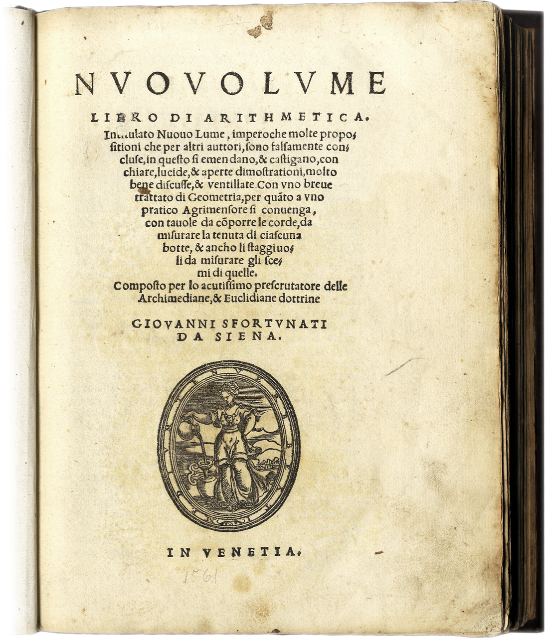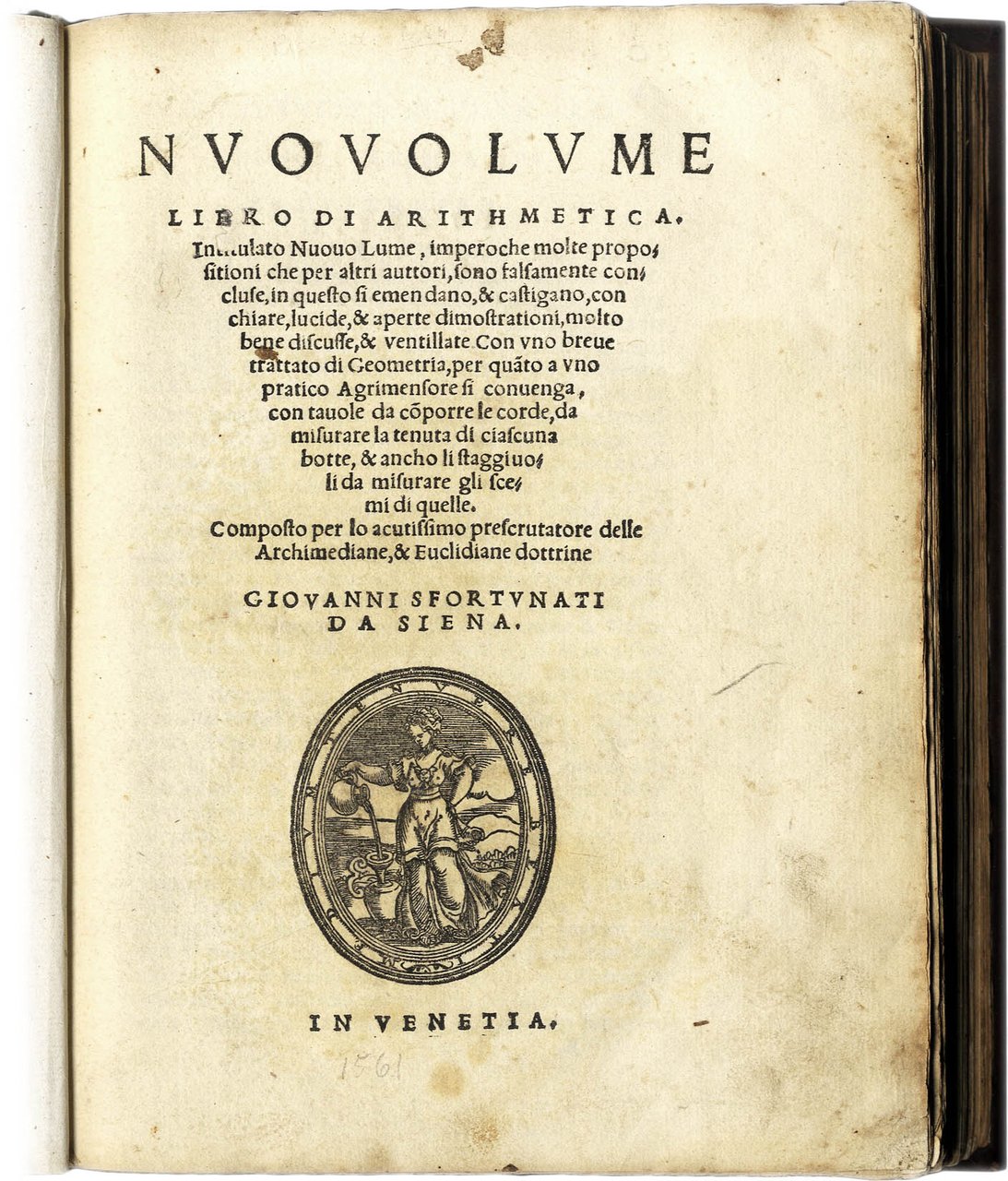 Nuovo Lume. Libro di Arithmetica. Intitulato Nuouo Lume, imperoche molte propositioni che per altri auttori, sono falsamente concluse in questo si emendano & castigano. Con uno breve trattato di Geometria, per quanto a uno pratico Agrimensore si conuenga... Composto per lo acutissimo prescrutatore delle Archimediane & Euclidiane dottrine Giovanni Sfortunati da Siena.