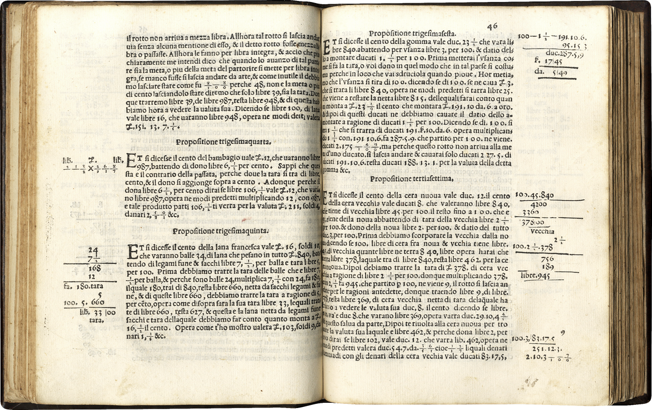 >in-4 (205x155 mm), ff. 129, (1 bianco), bel caratt. tondo. Ottima leg. 800.sca piena pelle, dorso a nervi, impressioni a secco ai piatti ad imitazione antica. Al tit. grande impresa dello stampatore con allegoria della Temperanza entro ovale. Numerosi schemi, calcoli e formule aritmetiche n.t. Precede l'opera la dedica dell'autore ad Afonso d'Este. Quarta edizione (prima Venezia, Zoppino 1534) di questo fortunato trattato popolare di aritmetica pratica, utile strumento per la gestione degli affari dei mercanti del XVI secolo. L'uso diffuso nel XVI secolo del volume come manuale aritmetico fa sì che, benché ristampato 7 volte, tutte le edizioni siano oggi estremamente rare. Ricco di spunti tratti dal Borghi e dal Feliciano, il lavoro dello Sfortunati, matematico senese vissuto nel XVI secolo, risulta particolarmente interessante per l'inserimento di tabelle mercantili numeriche e di misurazioni pratiche. Esempl. con ampi margini, ottimo. Adams S-1043. Sander 6965, note. Riccardi I, 453. Smith, Rara Arithmetica, p.174