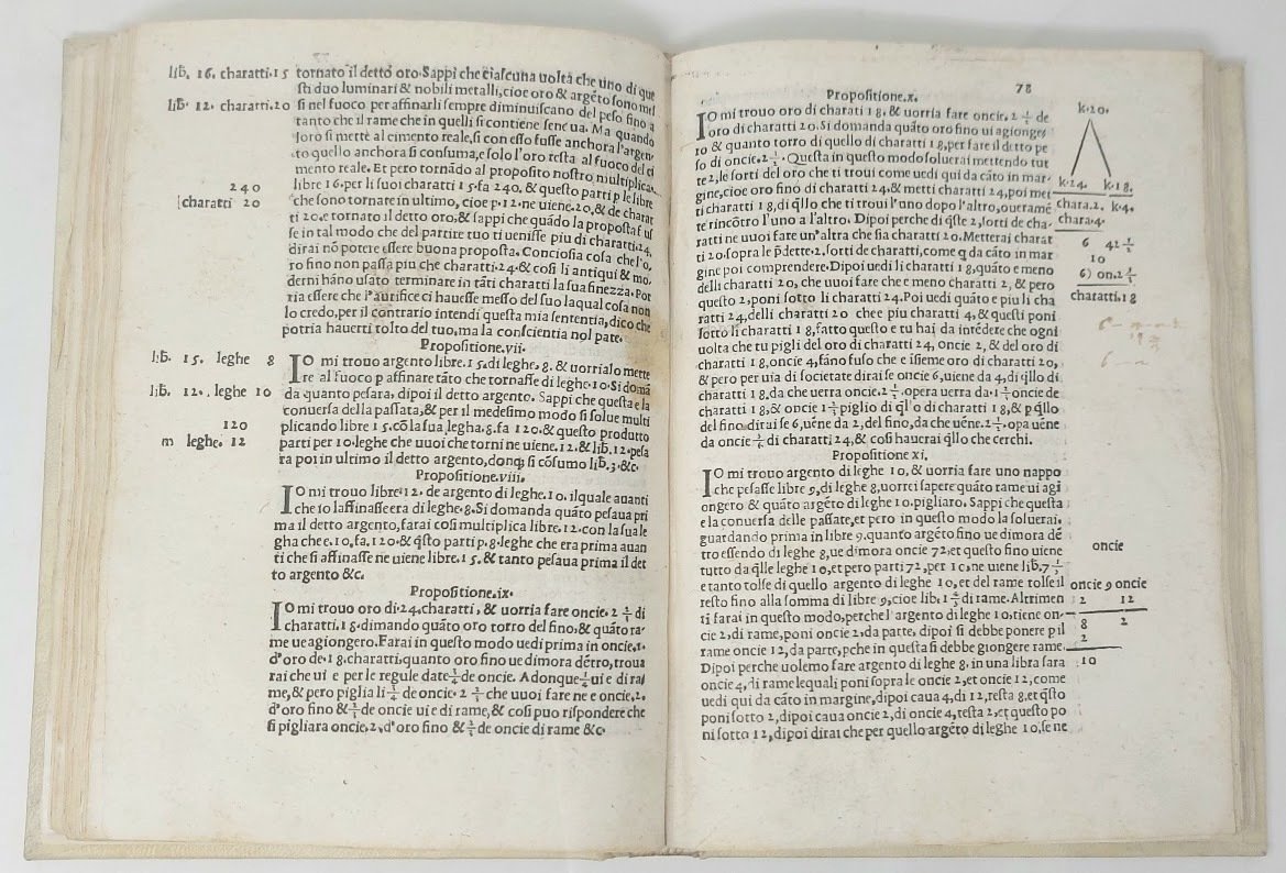 >in-4, ff. 129, (1 bianco), bel caratt. tondo. Leg. posteriore in pergamena rigida. Titolo entro ricca bordura con figure in xilografia; grande impresa dello stampatore in fine, numerosi schemi, calcoli e formule aritmetiche posti nei margini delle pagine. Precede l'opera la dedica dell'Autore ad Afonso d'Este. Seconda edizione (prima Venezia, Zoppino 1534) di questo fortunato trattato popolare di aritmetica pratica, utile strumento per la gestione degli affari dei mercanti del XVI secolo. L'uso diffuso nel XVI secolo del volume come manuale aritmetico pratico fa sì che, benché ristampato 7 volte, tutte le edizioni siano oggi estremamente rare. Ricco di spunti tratti dal Borghi e dal Feliciano, il lavoro dello Sfortunati, matematico senese vissuto nel XVI secolo, risulta particolarmente interessante per l'inserimento di tavole mercantili e di misurazioni pratiche. Buon esemplare. Adams S-1043. Sander, 6965.