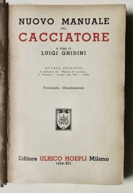 In 12° (mm 200x125). Pagg. 660. Opera arricchita da trecento illustrazioni nel e fuori testo; ad ampio respiro tratta gli argomenti riguardanti la caccia: dalle armi, munizioni, cani, selvaggina, cacce speciali, bracconaggio, migrazioni, pratiche per conseguire il permesso di porto d'armi e di caccia, alla legislazione e decreti vari. Tela posteriore, con titolo in oro su tassello in pelle rossa originale, al dorso. Buon esemplare. <BR>